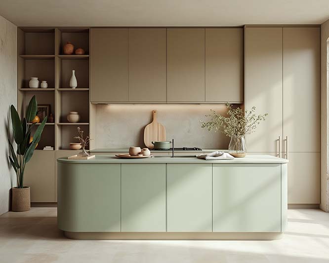 近年のミラノサローネでもよく見られる R調(曲線や曲面のデザイン)や丸みのあるインテリアデザインに注目しました。最近はマンションの建築自体が従来の角ばった形状ばかりではなく、丸みを帯びたような形状や、曲線の要素をもったマンションをよく見かけるようになった気がします。建築や外装の丸みが、専有部の間取りやデザインにも反映されているところが増えています。特に、アイランドキッチンやダイニングテーブルに柔らかい曲線デザインが用いられていた事例が見られ、このようなデザインは空間の回遊性にも寄与していると思います。直線的なデザインよりも、やさしい印象で、よりぬくもりを感じ、心地良さを感じられます。また、高額マンションでよく見られる折り上げ天井も、曲線デザインが用いられ、柔らかい間接照明をより効果的に見せているところがありました。マンションの販売価格が高騰するなかで、高級感を表現する要素として、天井は意匠性があがってきているかもしれません。
