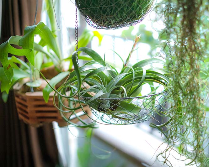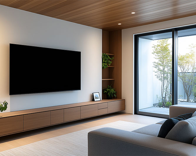 バイオフィリックデザインとは 建築や空間デザインにおいて、自然とのつながりを重視し、観葉植物を取り入れたり、日差しが差し込むことで自然とのつながりを求める 「バイオフィリア」 の概念を取り入れ、リラックス効果や集中力の向上が期待できるデザイン手法をさします。以前からグリーンや植栽を用いた空間演出はよく見られていましたが、今回のモデルルーム調査でも多くの事例が見られました。バイオフィリックデザインの視点としては、単にグリーンがあるだけでなく、「光による影」や「風による動き」といった「五感を刺激するような要素」も重要です。また背の高いグリーンやハンギングタイプは、垂直方向に空間を彩り、かつ間仕切りの役割を果たしていることもあると思います。