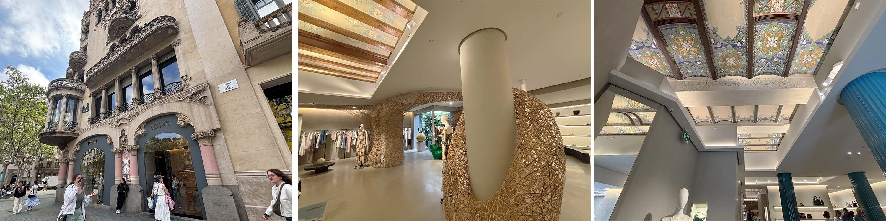 バルセロナにあるLOEWEに行ってきました。店舗の建築は1900年代にムンタネーが改築したもので、当時のボールド天井やフレスコ画が残されています。店内は地中海を想起させるブルーのタイル(スペインのセラミックタイルメーカーCeràmica Cumella製)のほか、田辺築雲斎など現代アーティストのコラボレーションも見られ、新旧のスペインカルチャーやデザインにふれられるショップデザインでした。