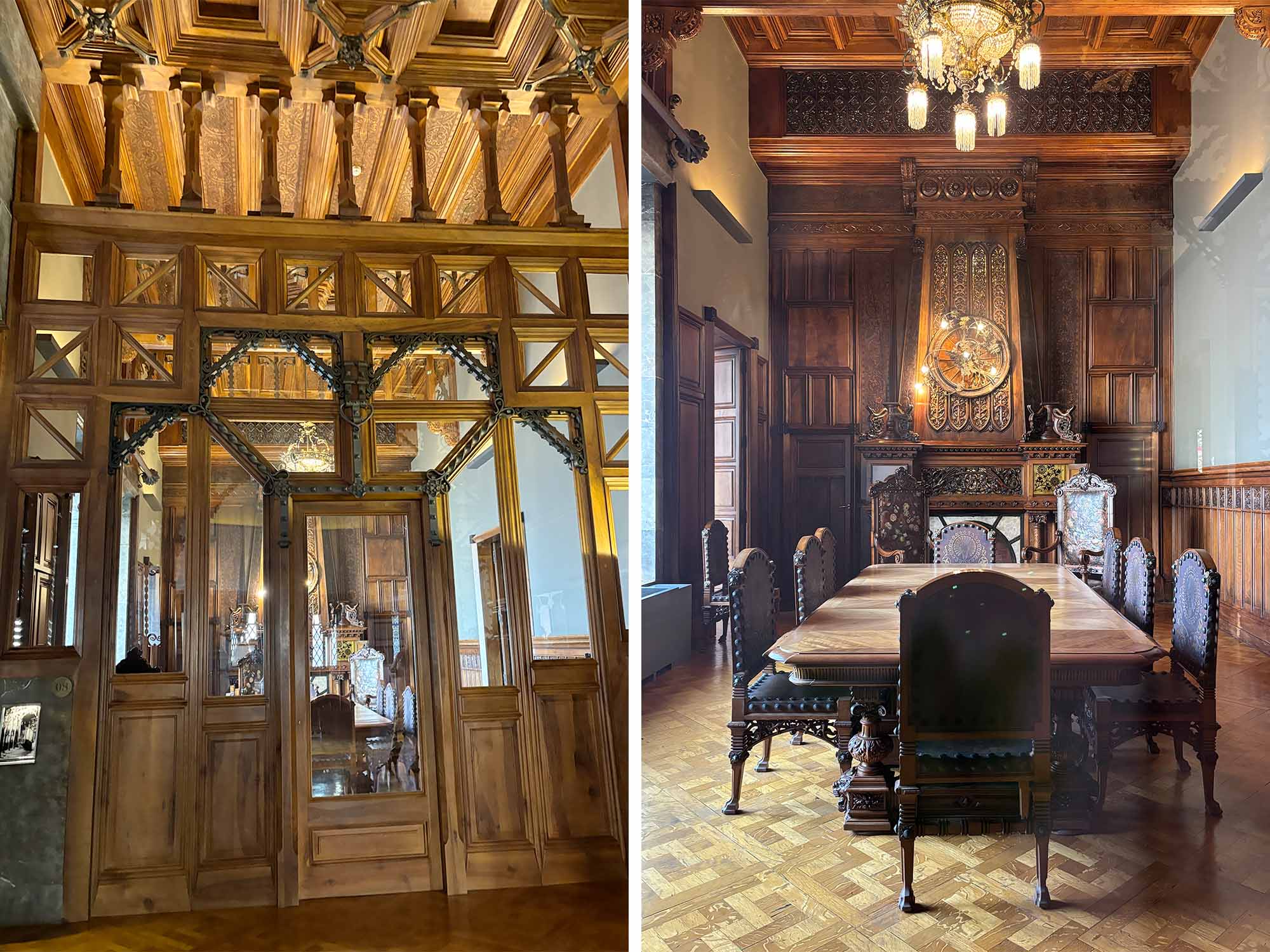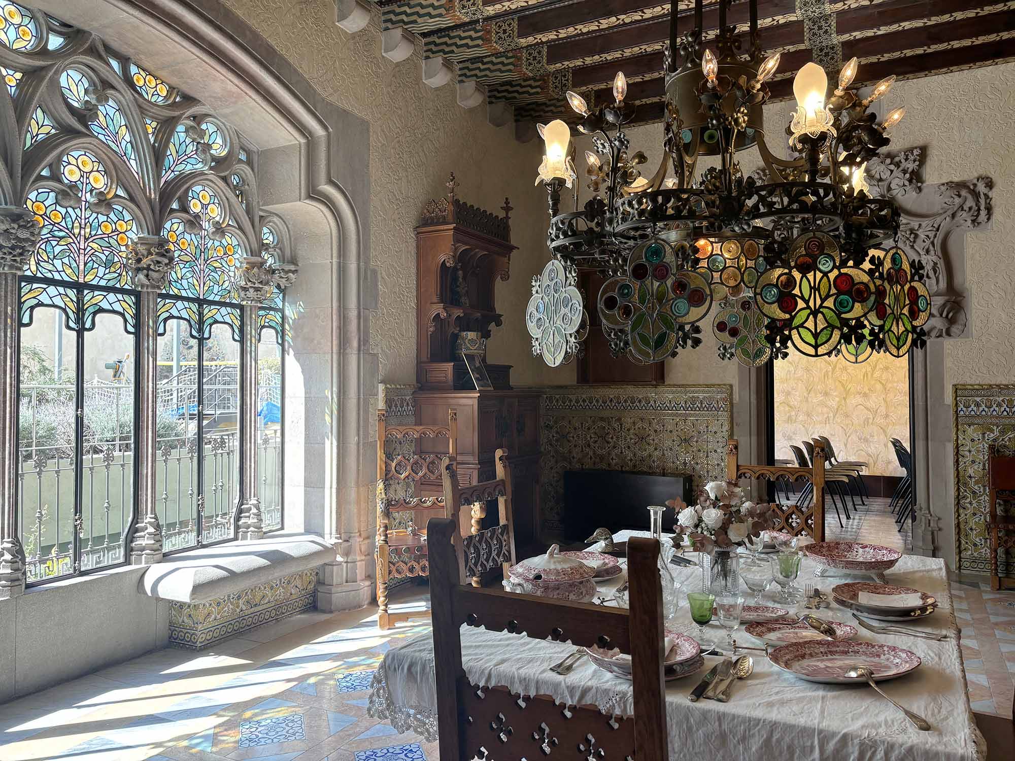 内部にはアントニ・アマトラーによって収集された、絵画やガラス作品などさまざまなコレクションが貯蔵されています。またインテリアはカラフルで美しいステンドグラスの繊細な設えが見られます。光の当たり具合によって表情を変え、室内にもその彩りが反射していました。家具もオリジナルで作られたもので、ダイニングルームの暖炉にはチョコレートにちなんだ彫刻もありました。