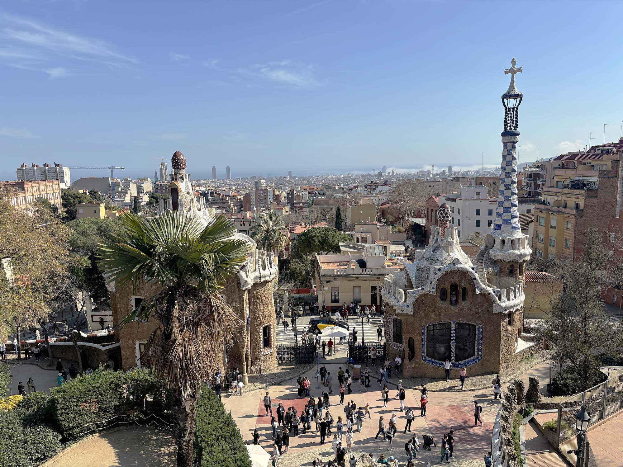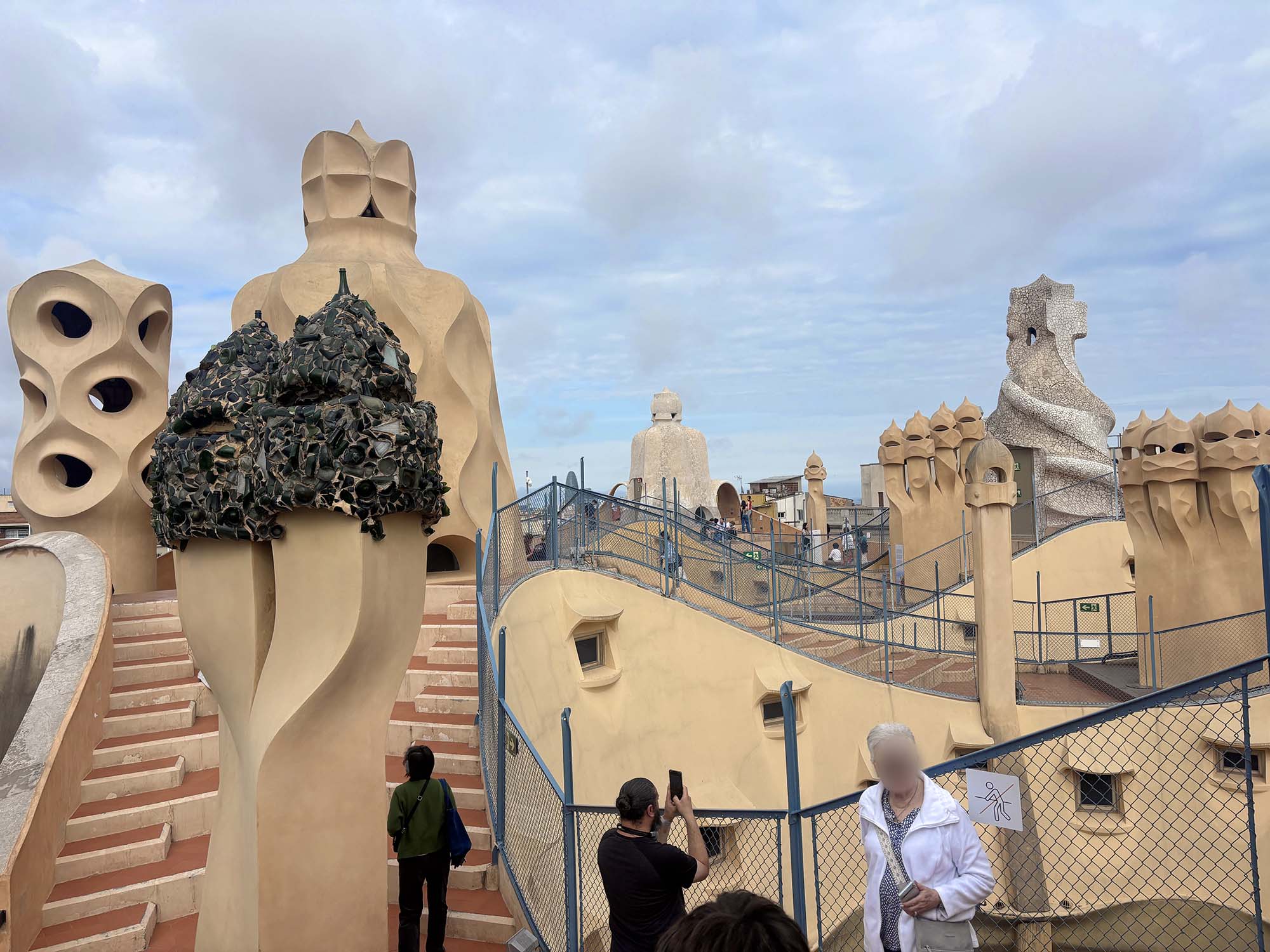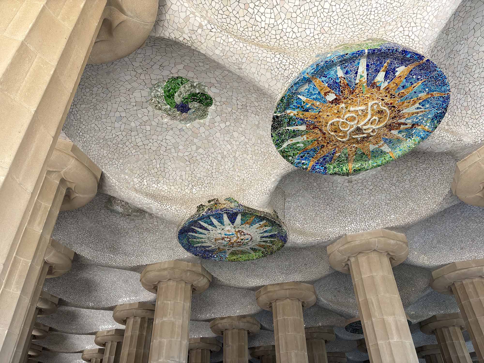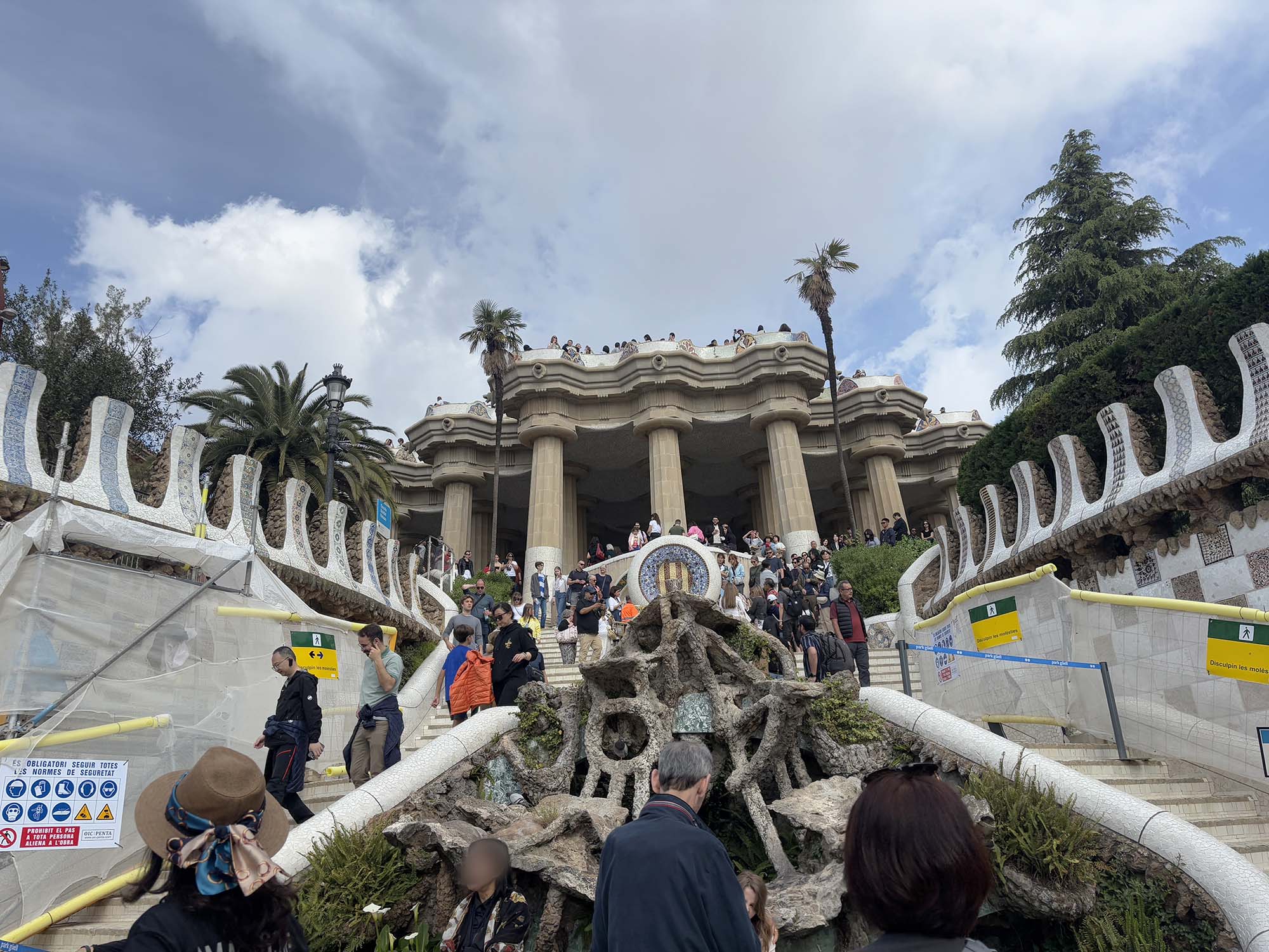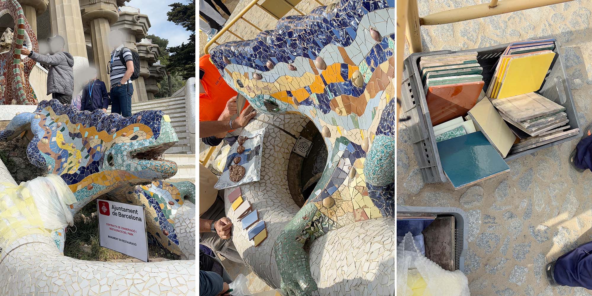 私が訪れたときは、ちょうどドラゴン像のタイルの修復作業中で、職人がさまざまな色のタイルを丁寧に確認している貴重な現場を見ることができました。ガウディが公園やモザイクに込めた思いが現代の職人にも受け継がれていることを感じました。