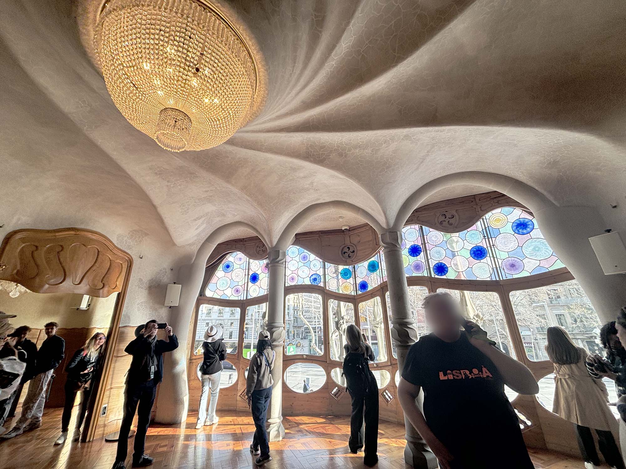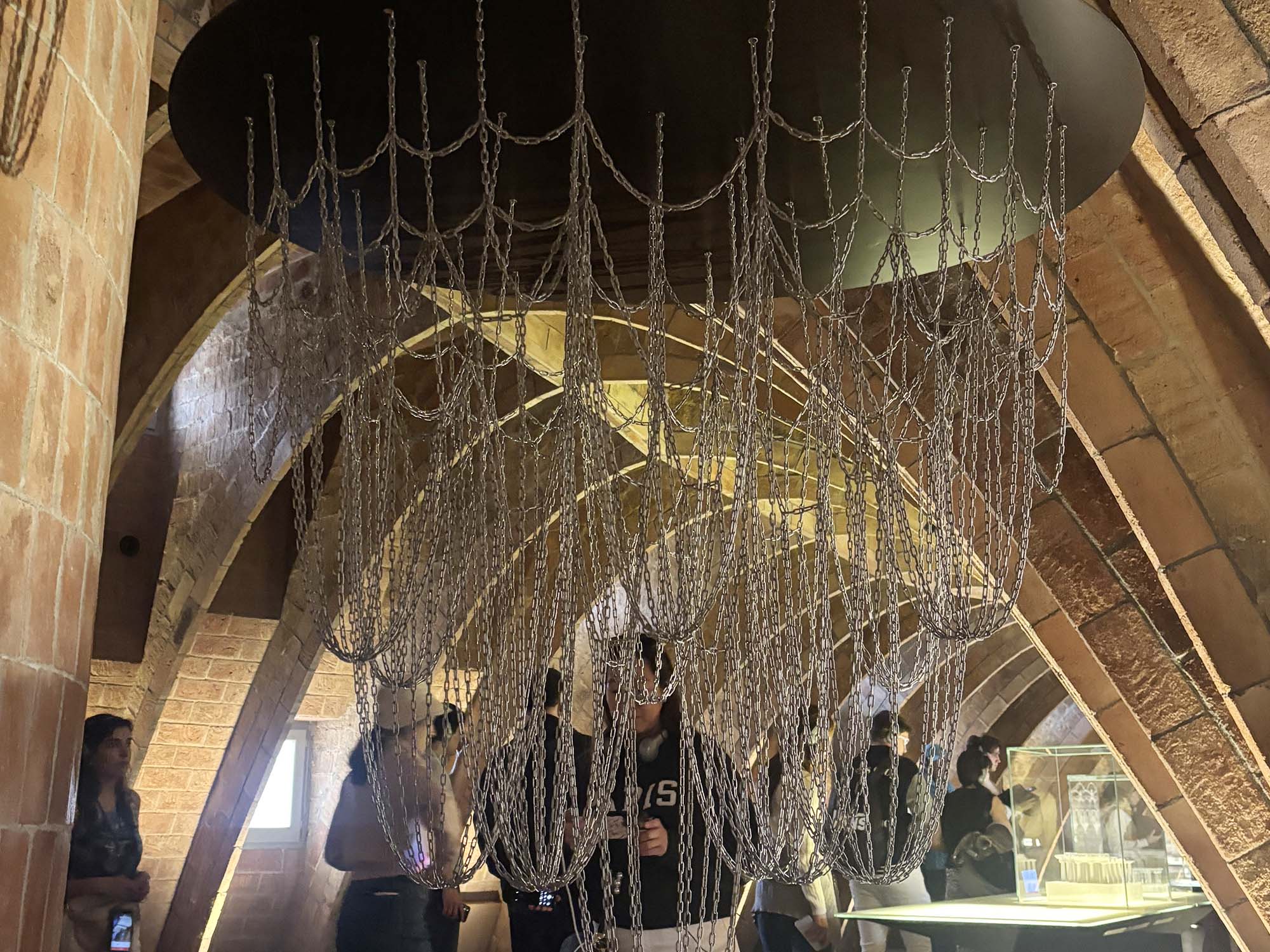 無数に垂れ下がる金属の鎖は階段を下る人の動きによって揺らいでいました。いかにも重く頑丈そうな鎖がキラキラと輝きながら柔らかく形を変え続ける姿は、水面あるいは深海に向かう光のベールのように感じます。カサ・バトリョ本体とはまったく違うアプローチでありながら、表現しようとしているものの類似点や違和感を感じ、この感じがスペインっぽい!と、新旧の建築家の不思議な共演を堪能することができました。