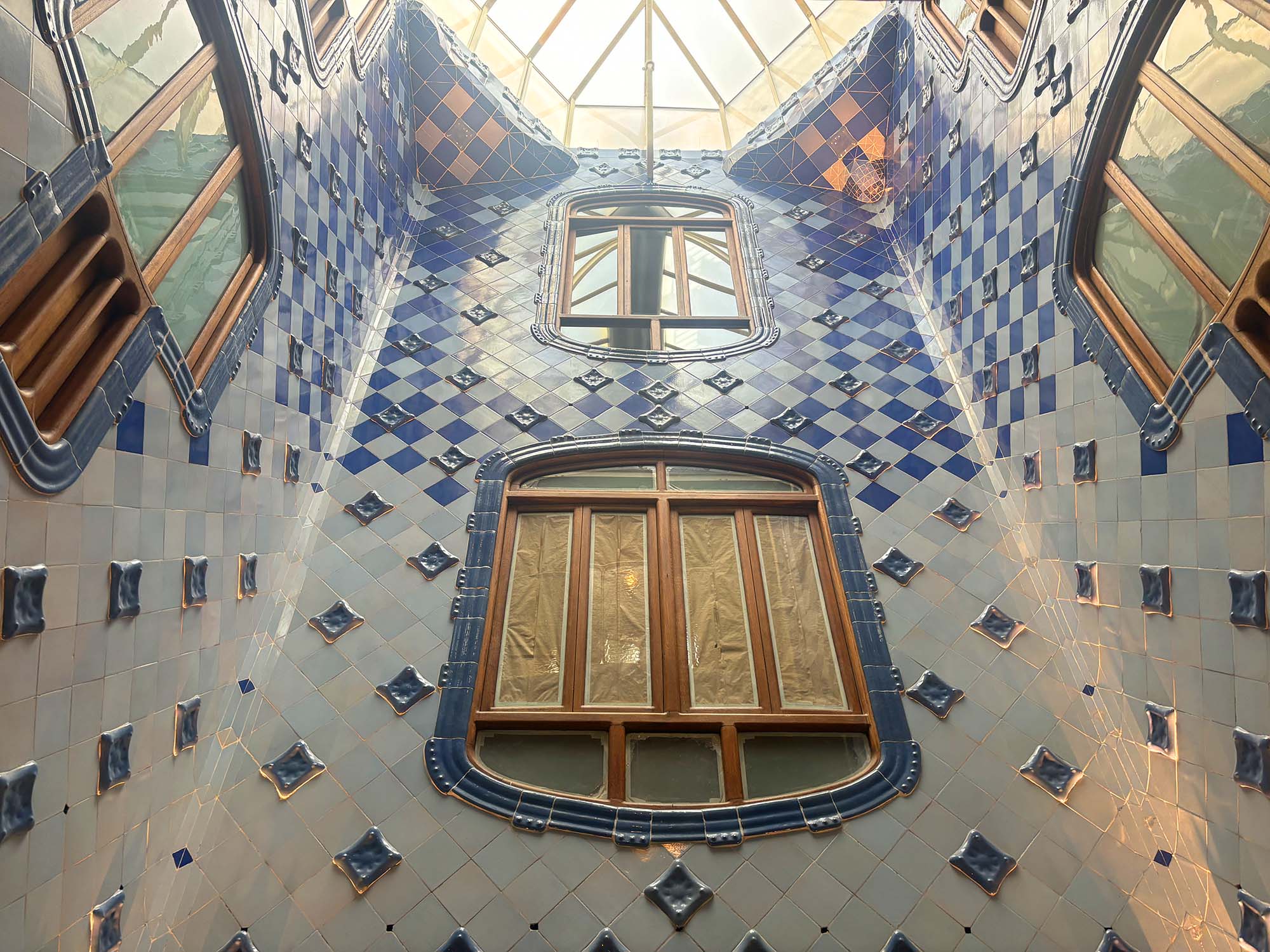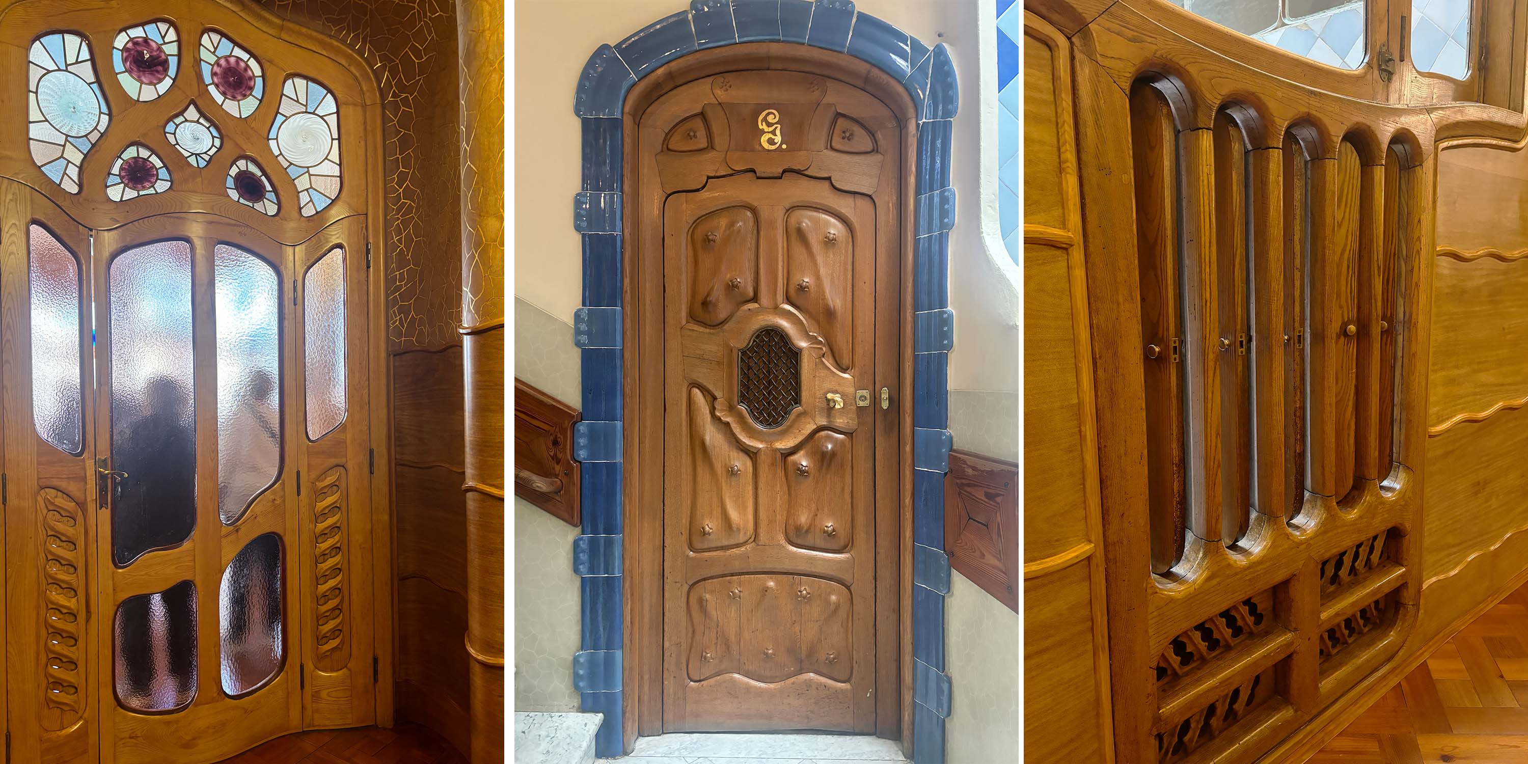 ガウディは自分のイメージを具現化するため、さまざまな専門家と一緒にカサ・バトリョを建築したと言われています。内部で使われている建具のデザインはどれも斬新で、上部にはガウディ自ら彫刻したアルファベットが刻まれていました。周りのステンドグラスと建具の立体的な装飾のおかげで、太陽の高さによる表情の変化も楽しめます。また空気の流れを調整するため、窓には魚のエラのように可動する換気口がありました。自然と一体になりながら考え抜かれたデザインは美しさだけでなく、機能面もしっかり考えられていますね。
