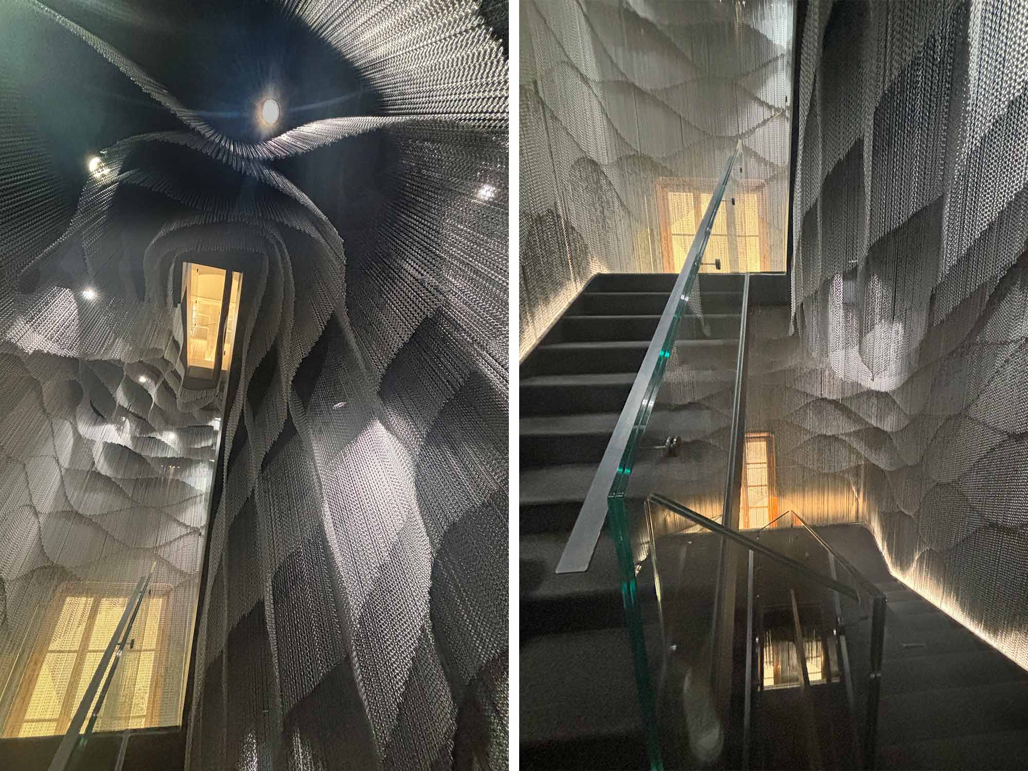 無数の金属製のチェーンで構成された空間は、カサ・バトリョの内部に見られた、海の水面の動きといった有機的な要素を感じつつも、内部に見られた鮮やかな色の要素をそぎ落とし、金属という単一素材に焦点をあて、光とマテリアルの関係にフォーカスした空間が展開されています。2020年に発表された空間で、天から地へ、光から影へ、カサ・バトリョで見られる地中海の光の美しさにオマージュされたデザインだそうです。