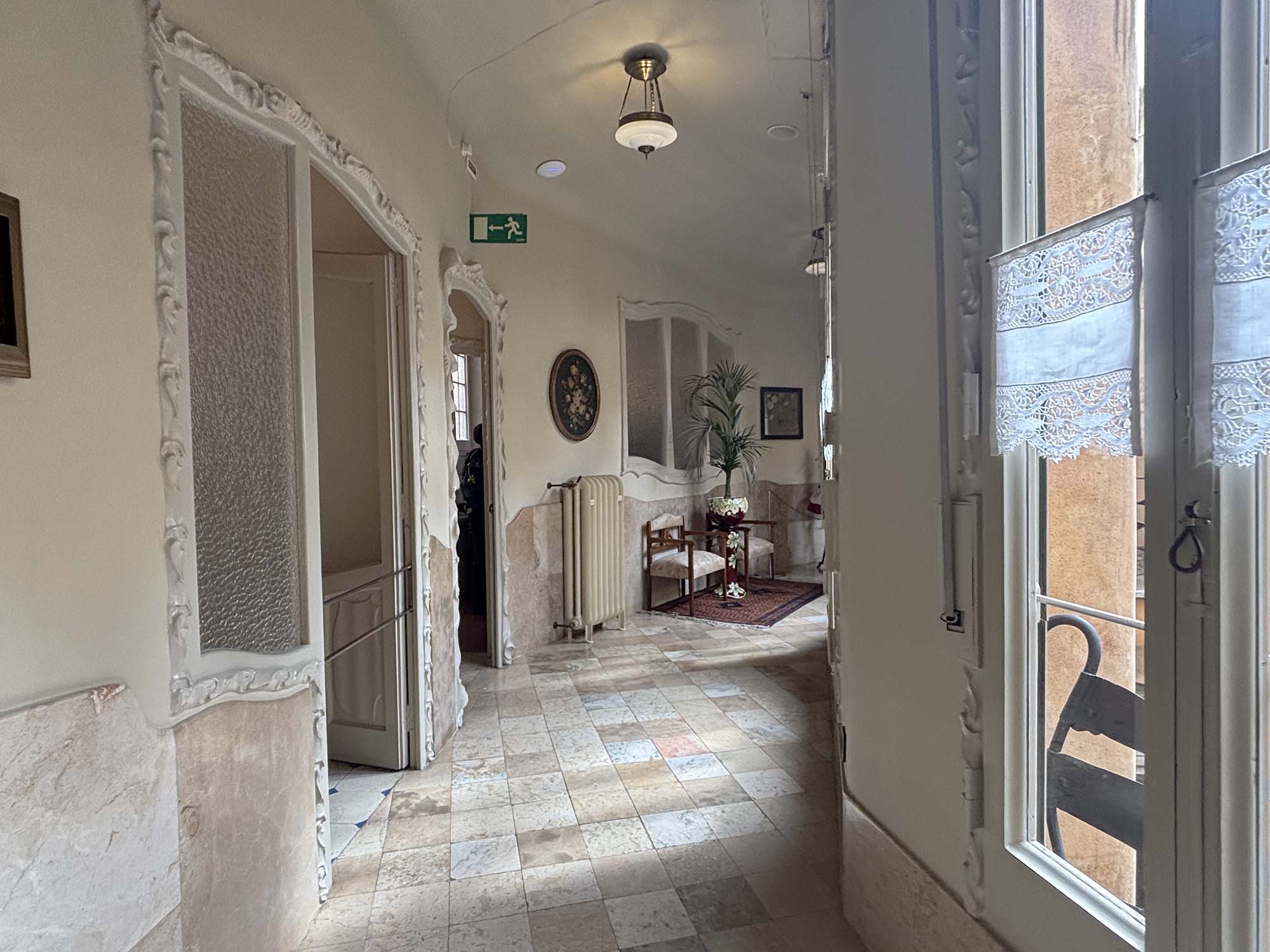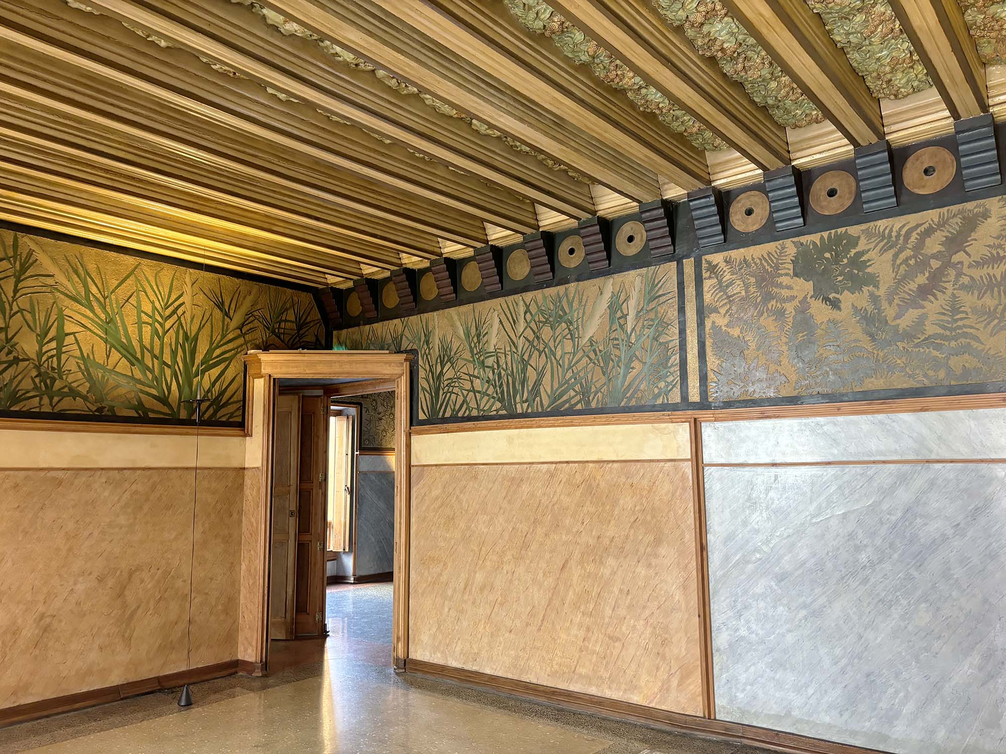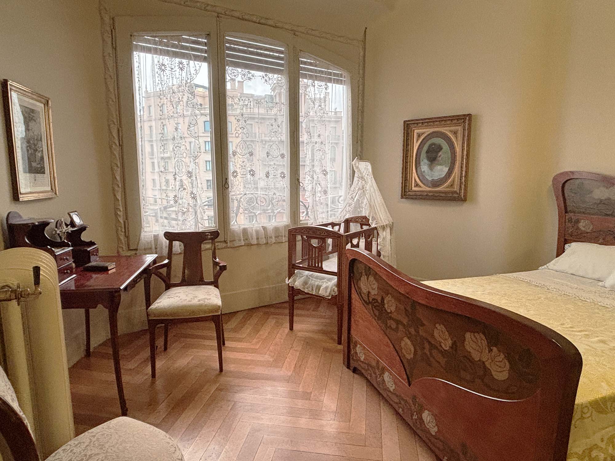 建物内に入ってみると、パティオに近い部分にはゆったりとした幅の廊下が設けられ、それぞれの部屋に日光や風が届くように設計されているように感じました。各居室に設えられた家具からは、ガウディのデザインらしい曲線美を感じます。床はあえて異なる樹種をミックスさせたヘリンボンやパーケットで構成され、高級感を感じさせていました。20世紀初頭のブルジョア階級の人たちの暮らしを垣間見ることができます。