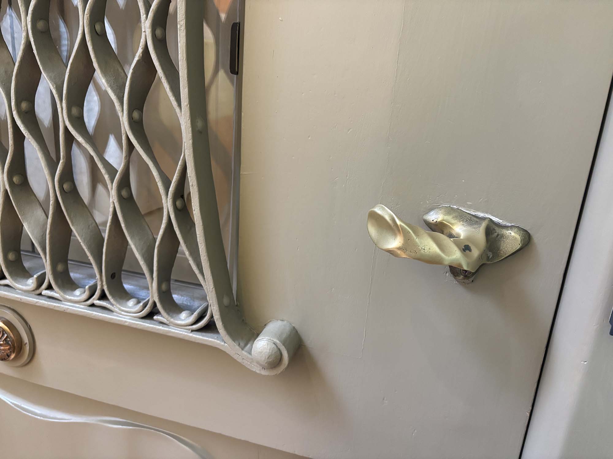 建具のハンドルも特徴的な形をしています。カサ・ミラのために、ガウディがデザインしたもので、粘土を人間が実際に握り、人間の手になじみやすいようにデザインされたものです。扉によって異なるデザインが採用されていて、さまざまな形状を楽しめます。ショップに行くと、このレバーハンドルは販売もされていました。