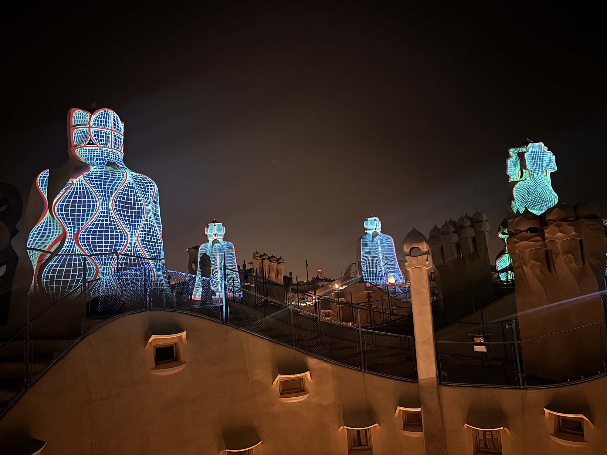屋上に上がると、カサ・ミラの特徴の一つである、ユニークな形状の階段塔屋をみることができます。これらは煙突や換気の役割も果たしています。屋上は回遊できるようになっていて、階段を上がったり下がったりしながら近くで造形を見ることができます。人の顔にも見えるこのデザインは、複数のモチーフからインスピレーションを得ているそうで、家を守る守護神もその一つと言われています。夜には、生命の起源とガウディ建築の本質をテーマにしたプロジェクションマッピングのショーも開催されています。