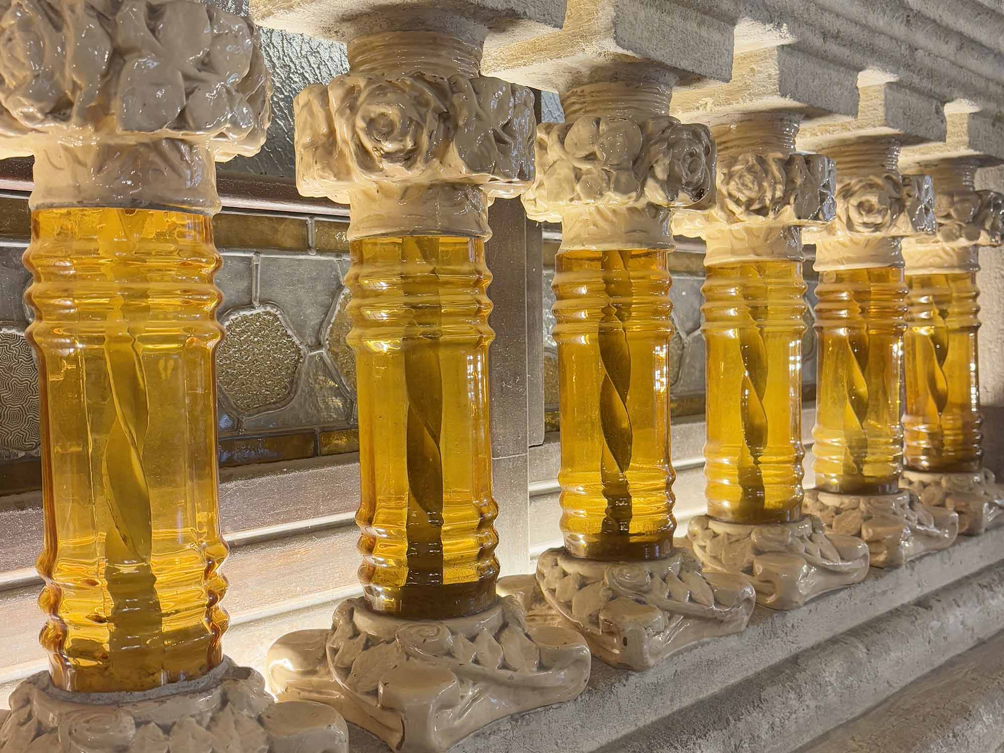 カタルーニャ音楽堂の中で、印象に残った2つのスペースをご紹介します。ひとつ目はバルコニーです。1階ホールから続くバルコニーの柱はカラフルなモザイクタイルで植物が描かれ、すべて異なる表情をしています。とても華やかで、建物から離れた外から見ても、その意匠性の高さを伺えます。2つ目は、ホールの階段です。階段の小柱はツイストした骨組みを琥珀色のガラスで包み込み、照明の効果もあいまって、とても美しい設えでした。通常は、階段全体が石あるいは木で構成されていることが多いですが、異なるマテリアルを組み合わせることで、音楽堂全体の華やかな雰囲気にマッチしていました。