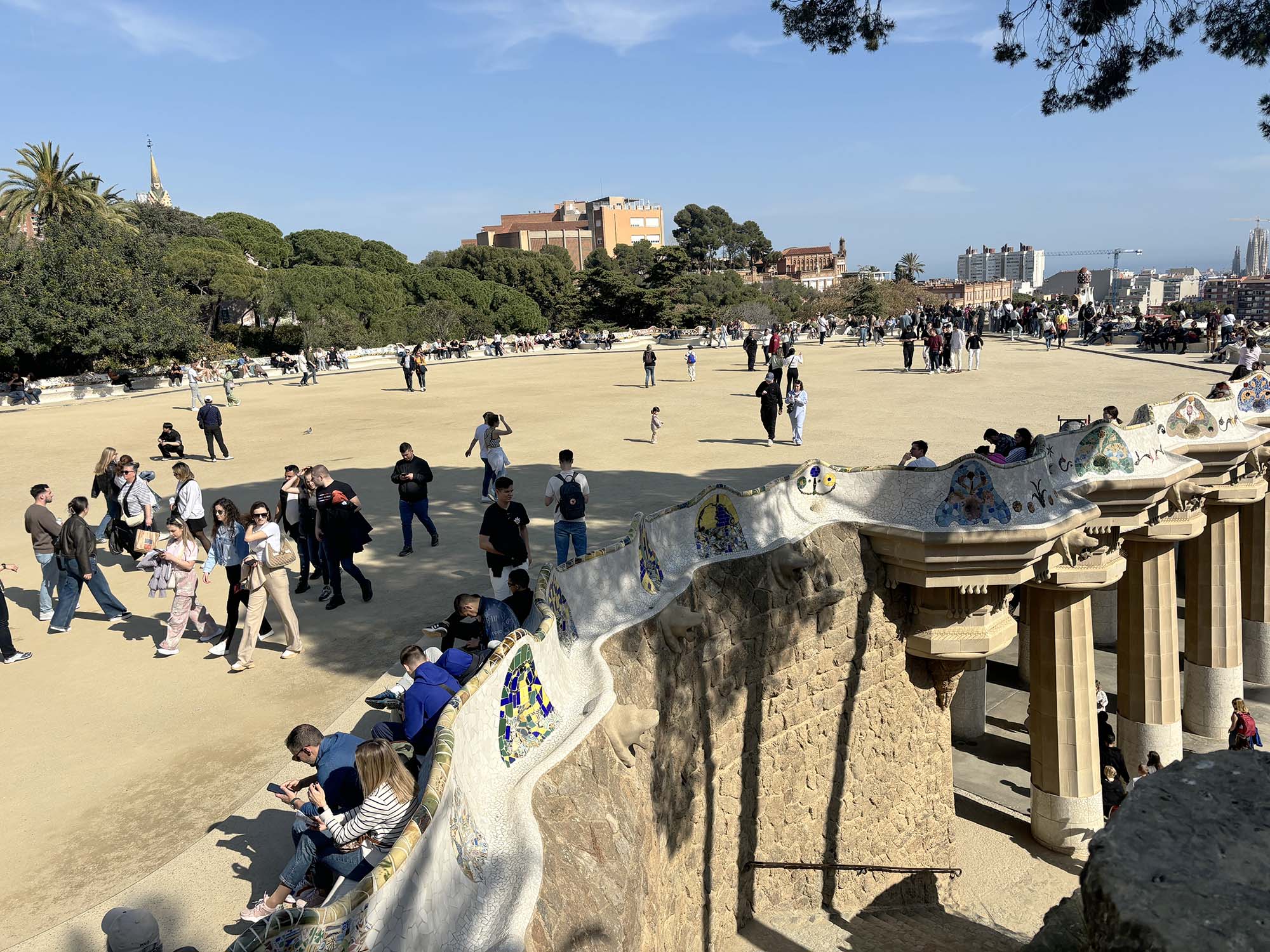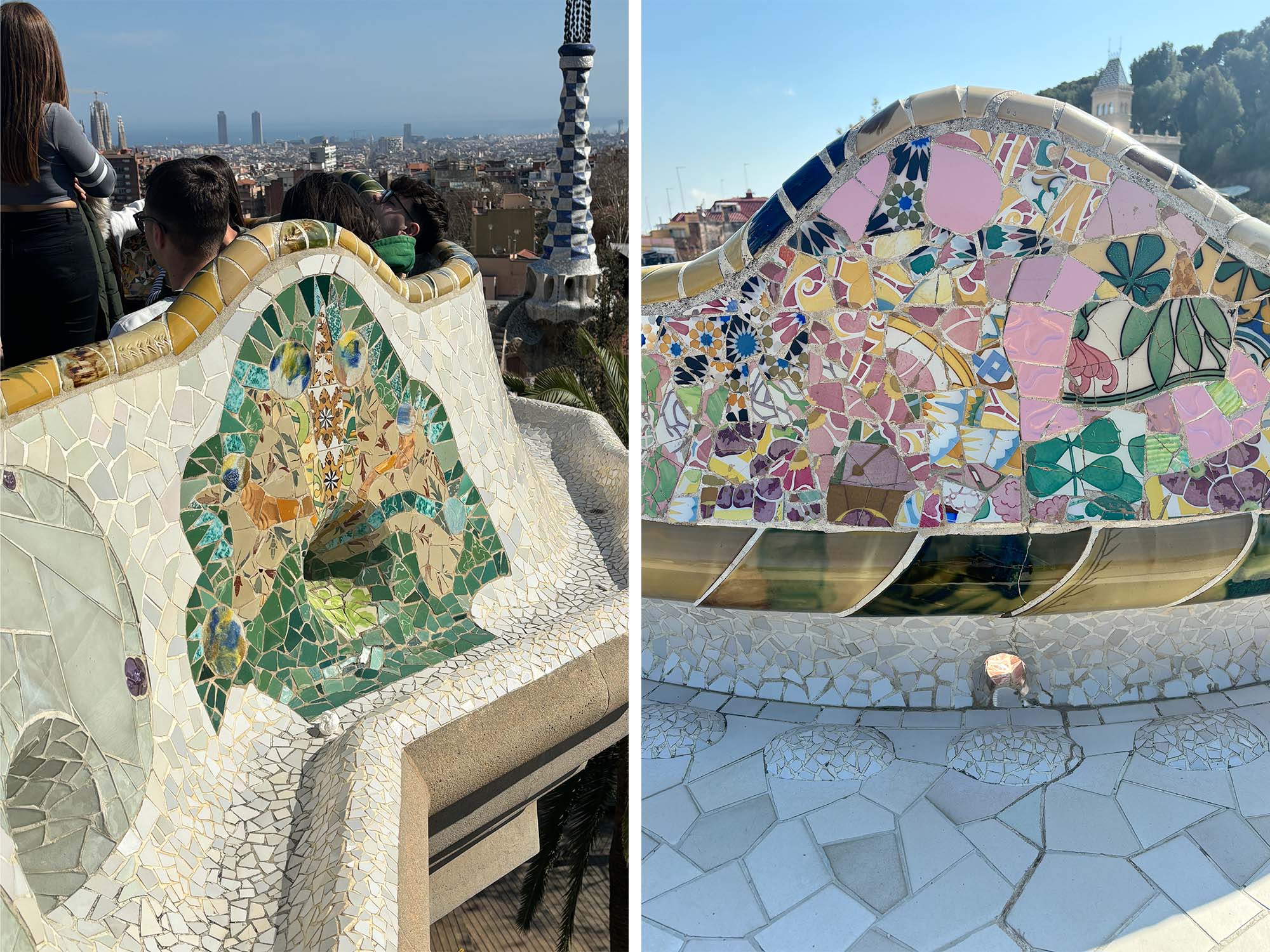 グエル公園の一番の見どころである中央広場。広大な広場を囲うように設えられた波打つベンチは、トレンカディスという手法が用いられています。陶器やタイルの破片を組み合わせて再構成するトレンカディスは、唯一無二の色と形の表情を生み出し、有機的な形状の構造デザインと調和していました。