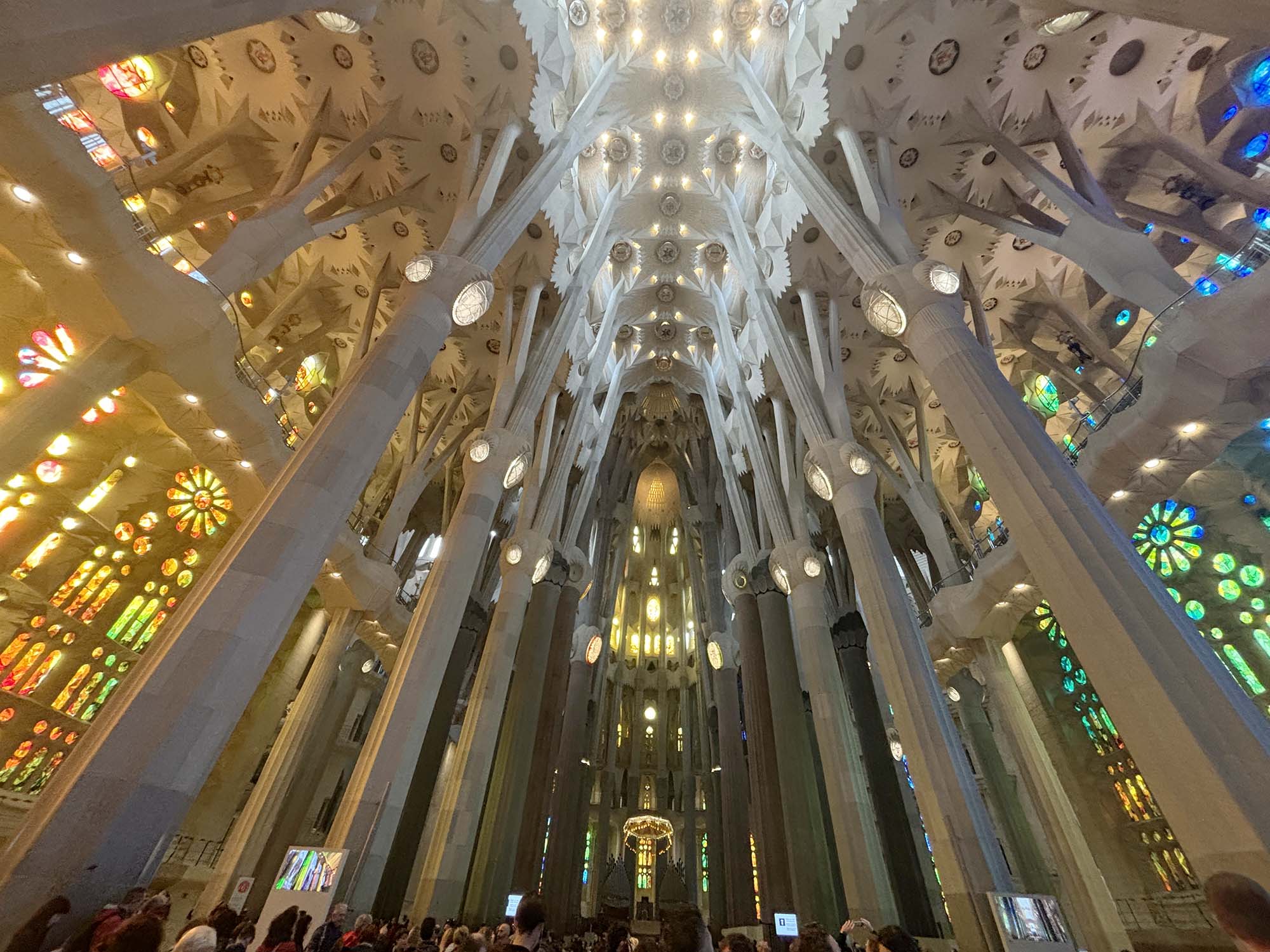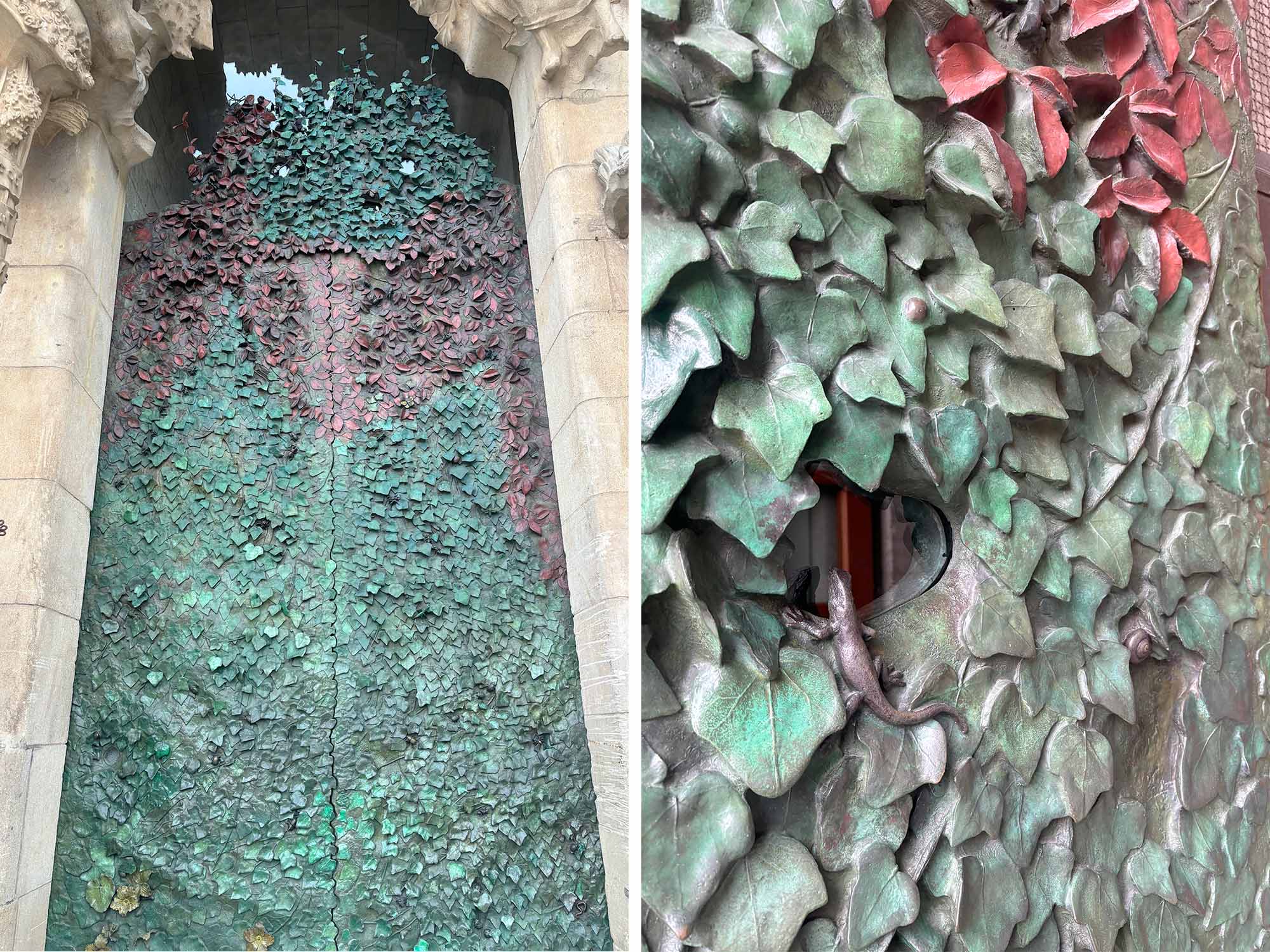 内部はさまざまなモチーフ、カラーを取り入れ、特に壁面から天井にかけて草木や花を描いた立体的な造形が空間をダイナミックに包み込んでいました。あえて梁を見せるような天井デザインの凹み部分には、複雑でリアルな植物の装飾が埋め尽くされ、ガウディの細部にわたる拘りを感じる圧巻の空間でした。