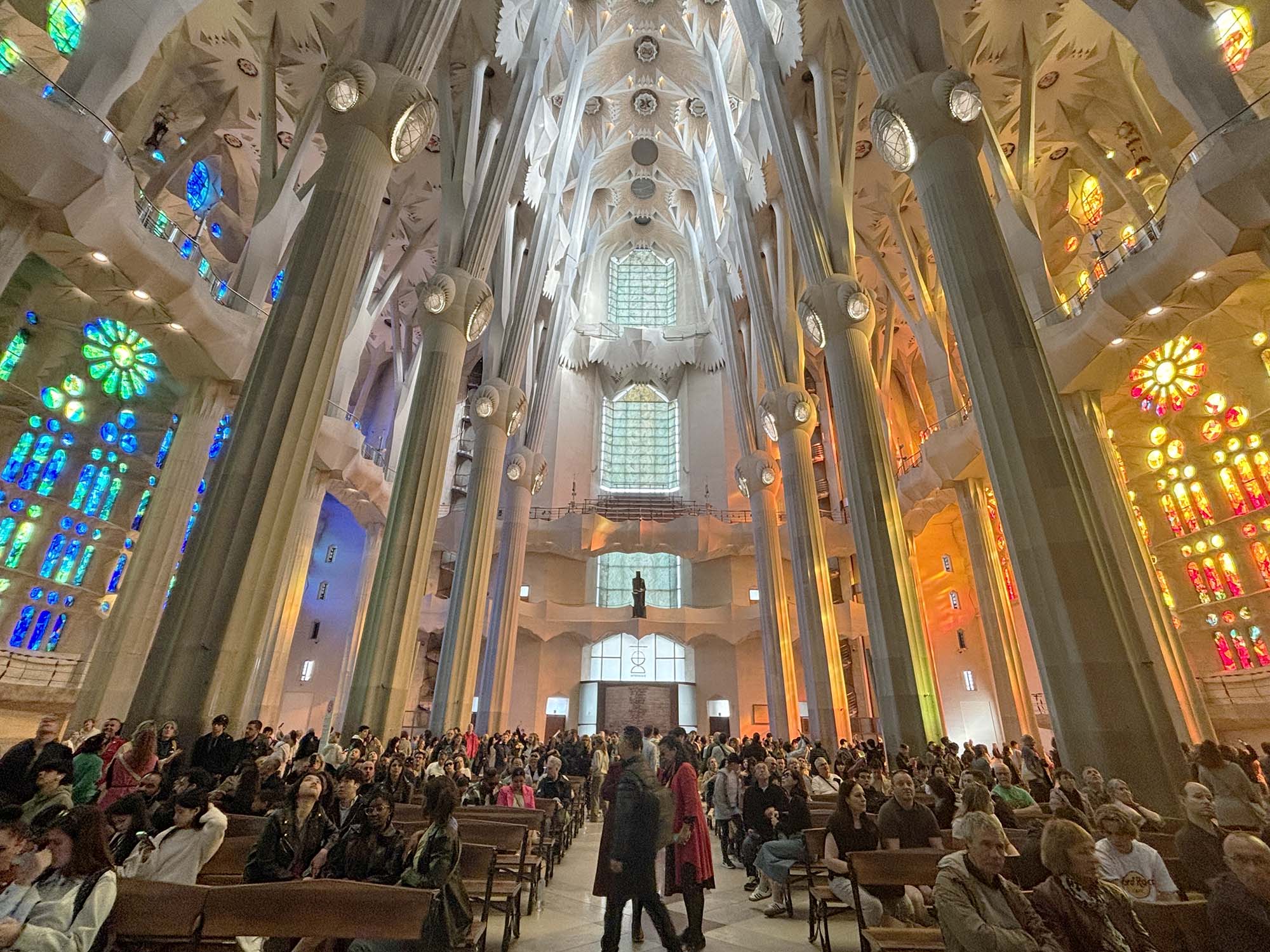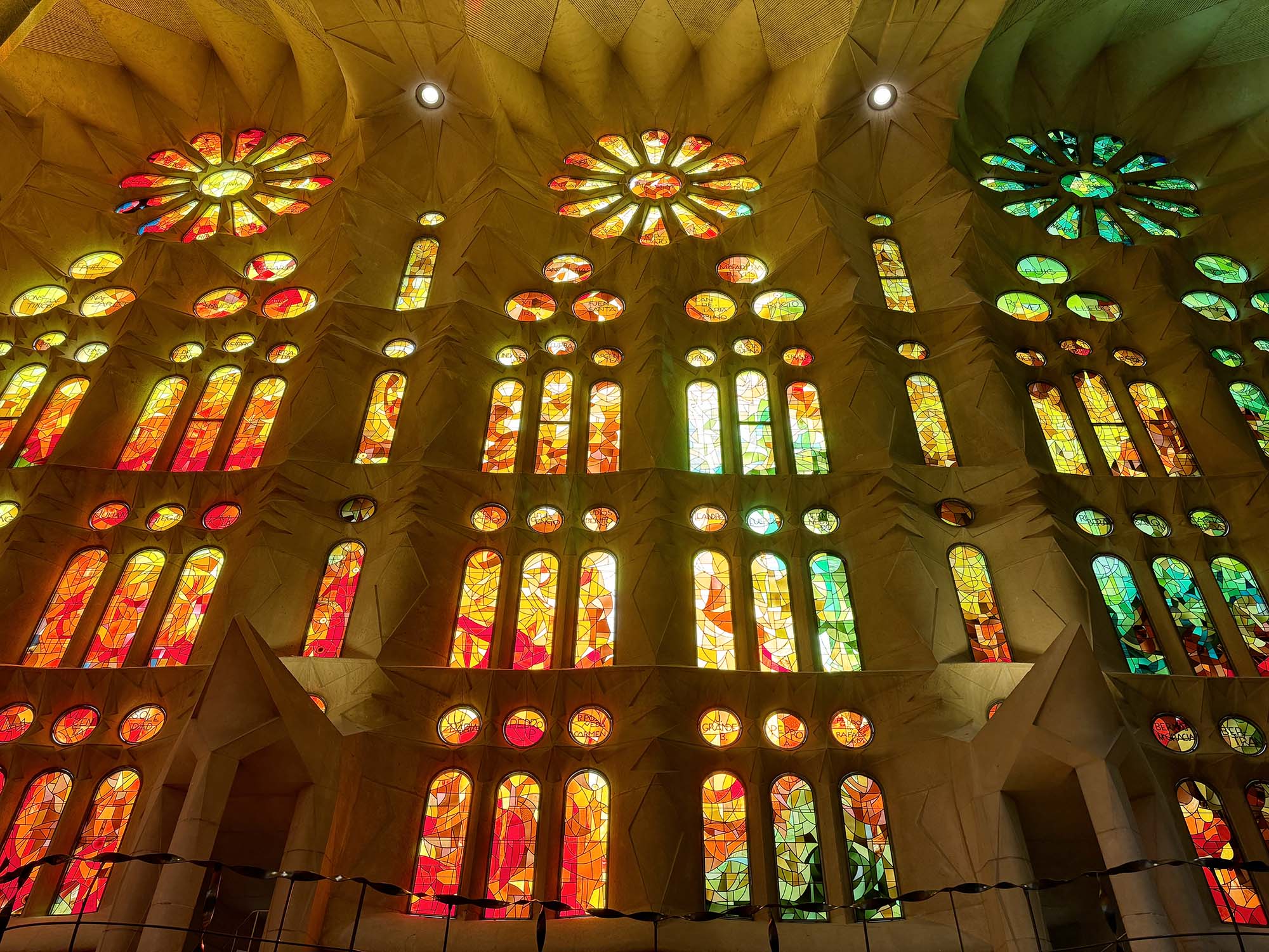 教会の内部に入ると、ステンドグラスから美しい光が差し込み、森の中に紛れ込んだような没入感を感じます。ステンドグラスは、ジョアン・ビラ・グラウ氏の作品で、生誕のファサードはブルーやグリーン、受難のファサードは赤やオレンジの光で構成されています。