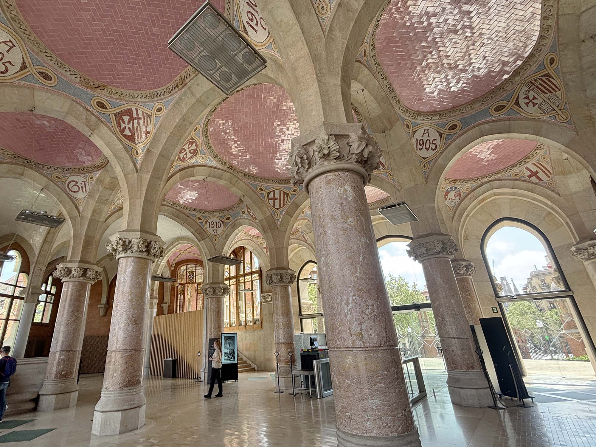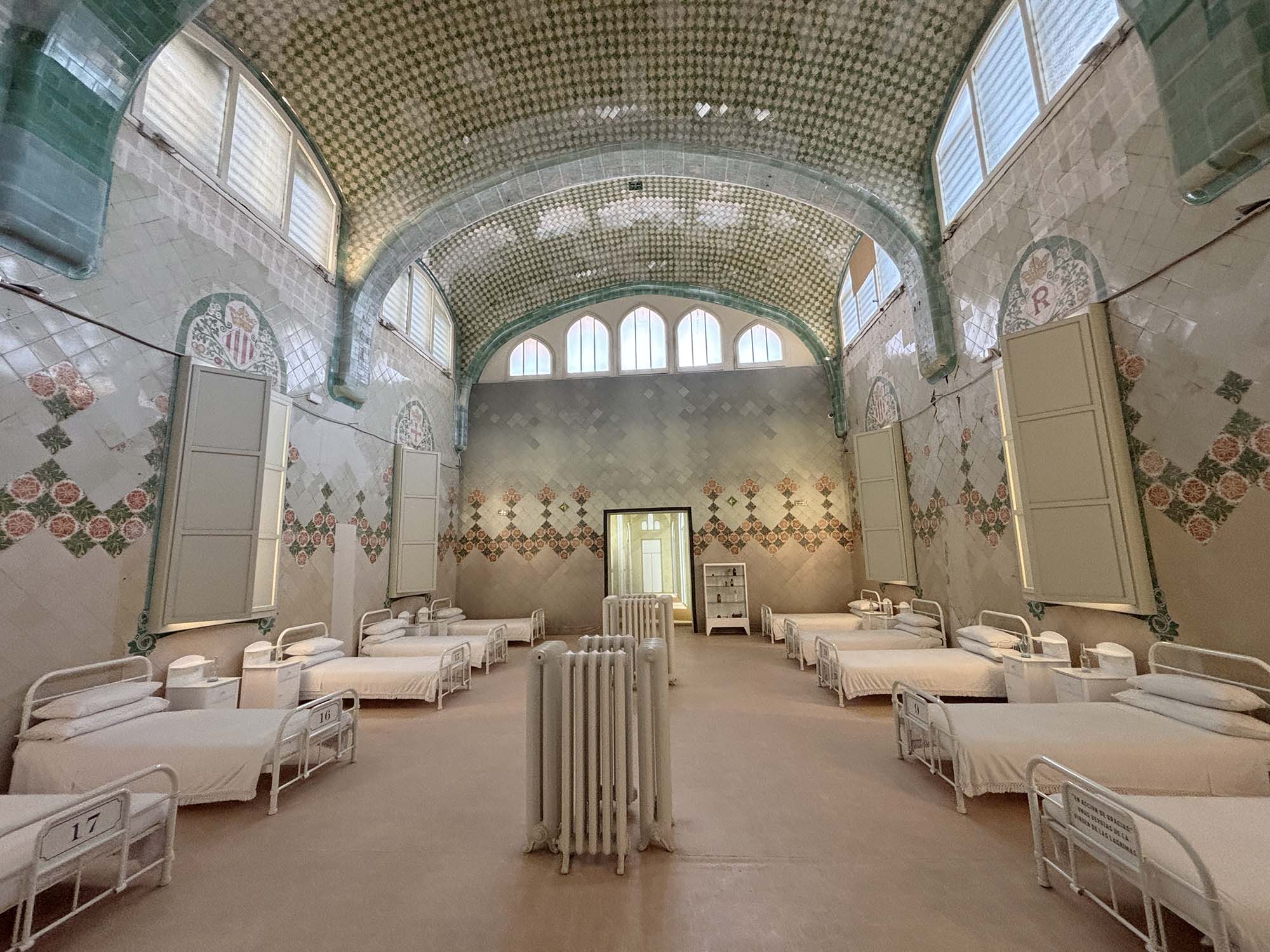 田園都市として構想された中央の庭園を中心に、教会のような美しい佇まいの複数の建築物で構成されています。公衆衛生を高めるためにも、それぞれの棟は診察室、手術室、病棟など、役割に分かれていました。各棟は地下でもつながっているため働く人、患者にとっても過ごしやすい空間が作られたそうです。いくつかの棟は内部の見学ができ、明るいグリーンやピンクのタイルで装飾されていました。
