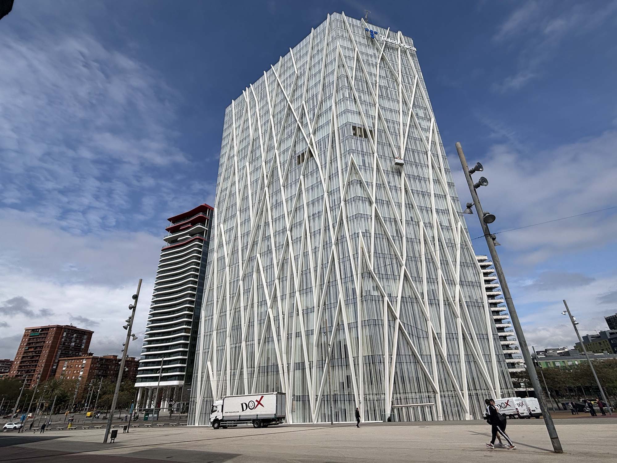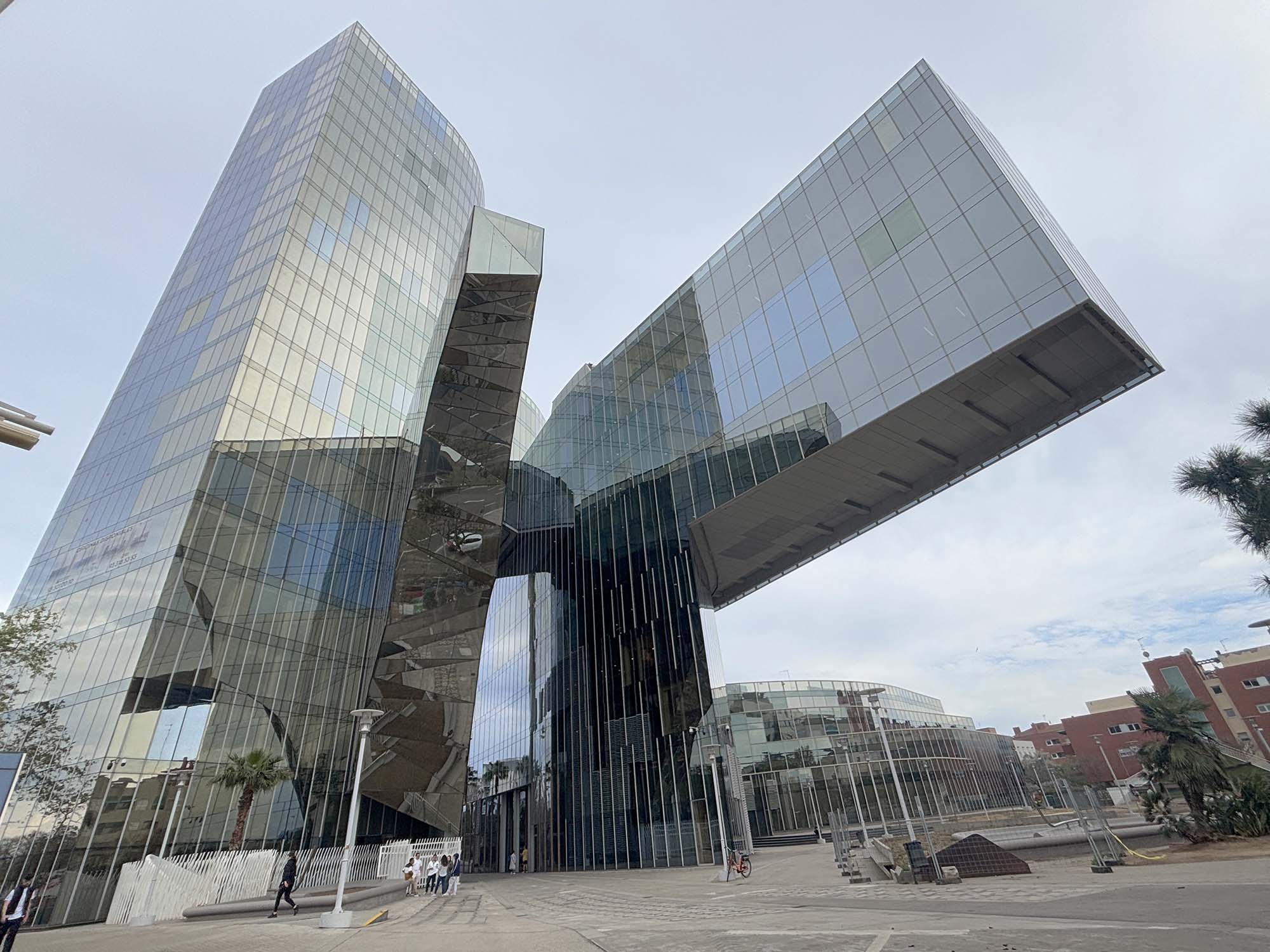 次に、不思議な形状をしたガラス張りの建物は、オフィスビルの Mare Nostrum Tower(正式名称:Gas Natural Building)です。片持ち梁構造により、水平方向にガラスのボリュームが突き出すような、ダイナミックなデザインが特徴です。