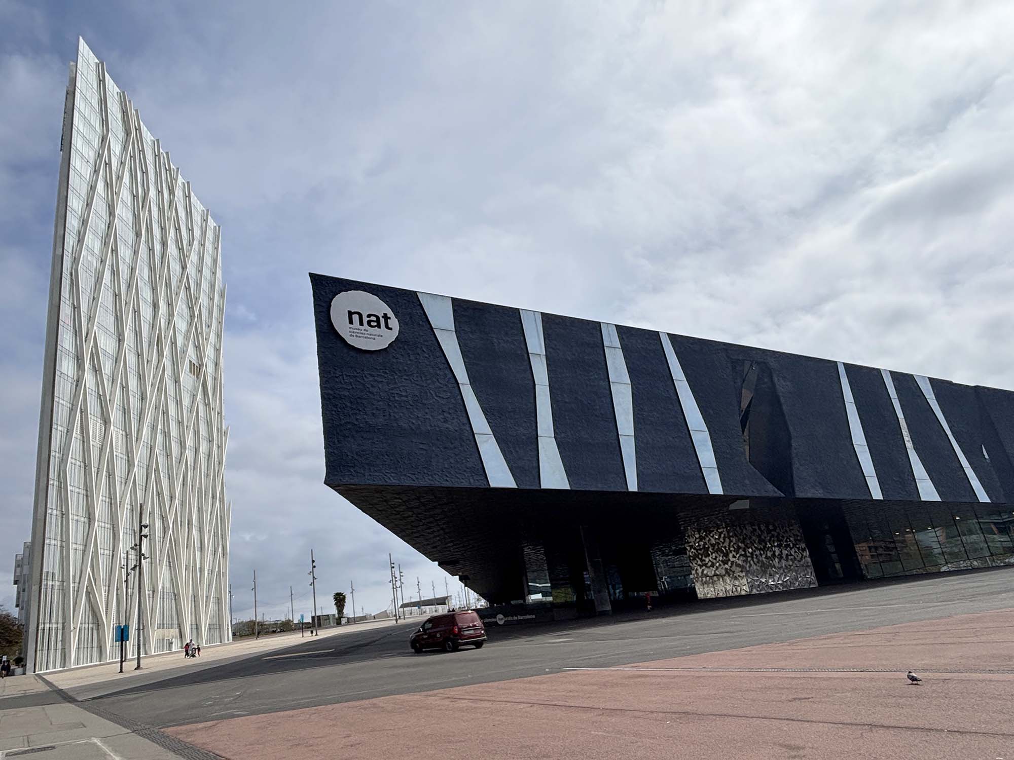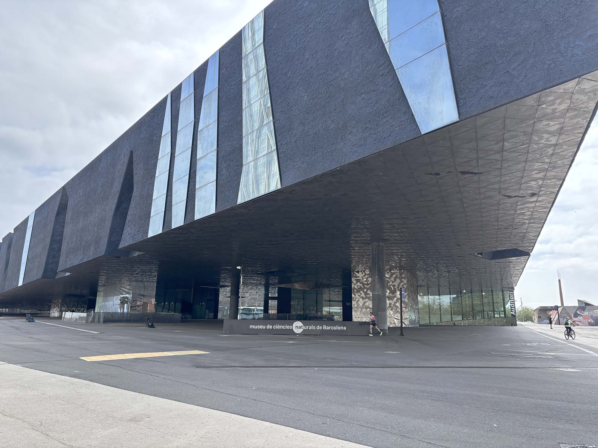 そしてその向かいにある建物は、スイスの建築家ユニットHerzog & de Meuronによって設計された自然科学博物館(Museum of Natural Sciences of Barcelona)です。写真ではダークグレー色に見えますが、やや青みの色で、鉱物の塊が宙に浮いたような佇まいです。