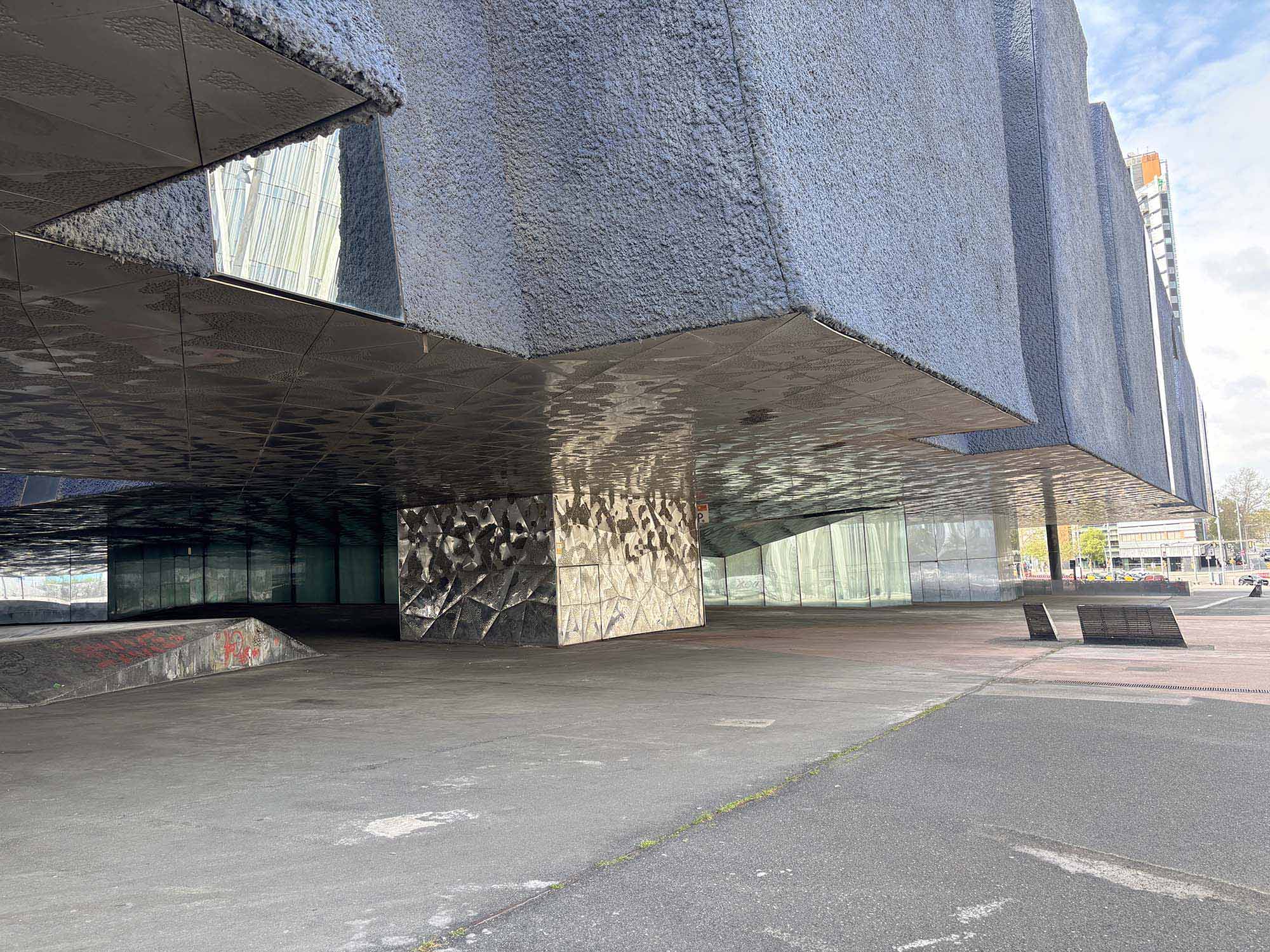 この建物も傾斜する道に立っているため、三角柱の造形物が、海からせり出してきているような印象でした。近寄ってみてみると、軒天や柱周りには金属のタイルが使われ、波打ったエクスチャーが水面のような輝きを放っています。