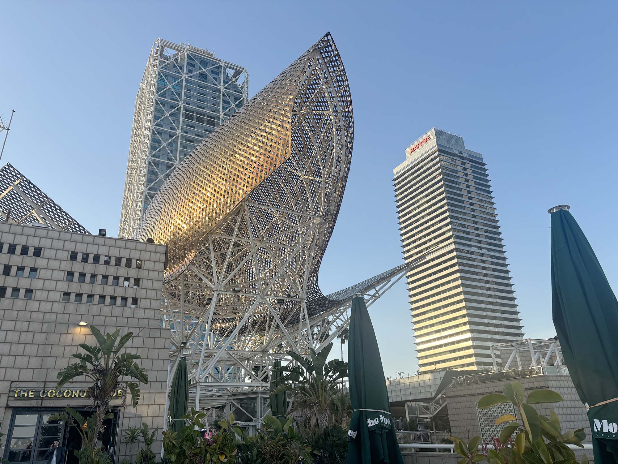 続いて、バルセロナ・ビーチでひときわ目を引くのが、フランク・ゲーリーによるモニュメント、フライング・フィッシュです。これは1992年のバルセロナ・オリンピック開催時に、オリンピック村の一部として設置されたもので、魚をモチーフにしています。金属製の造形物は長さ50mを超え、太陽光が当たるとゴールドに輝き、躍動感あふれるデザインです。バルセロナビーチのアイコンとなっています。