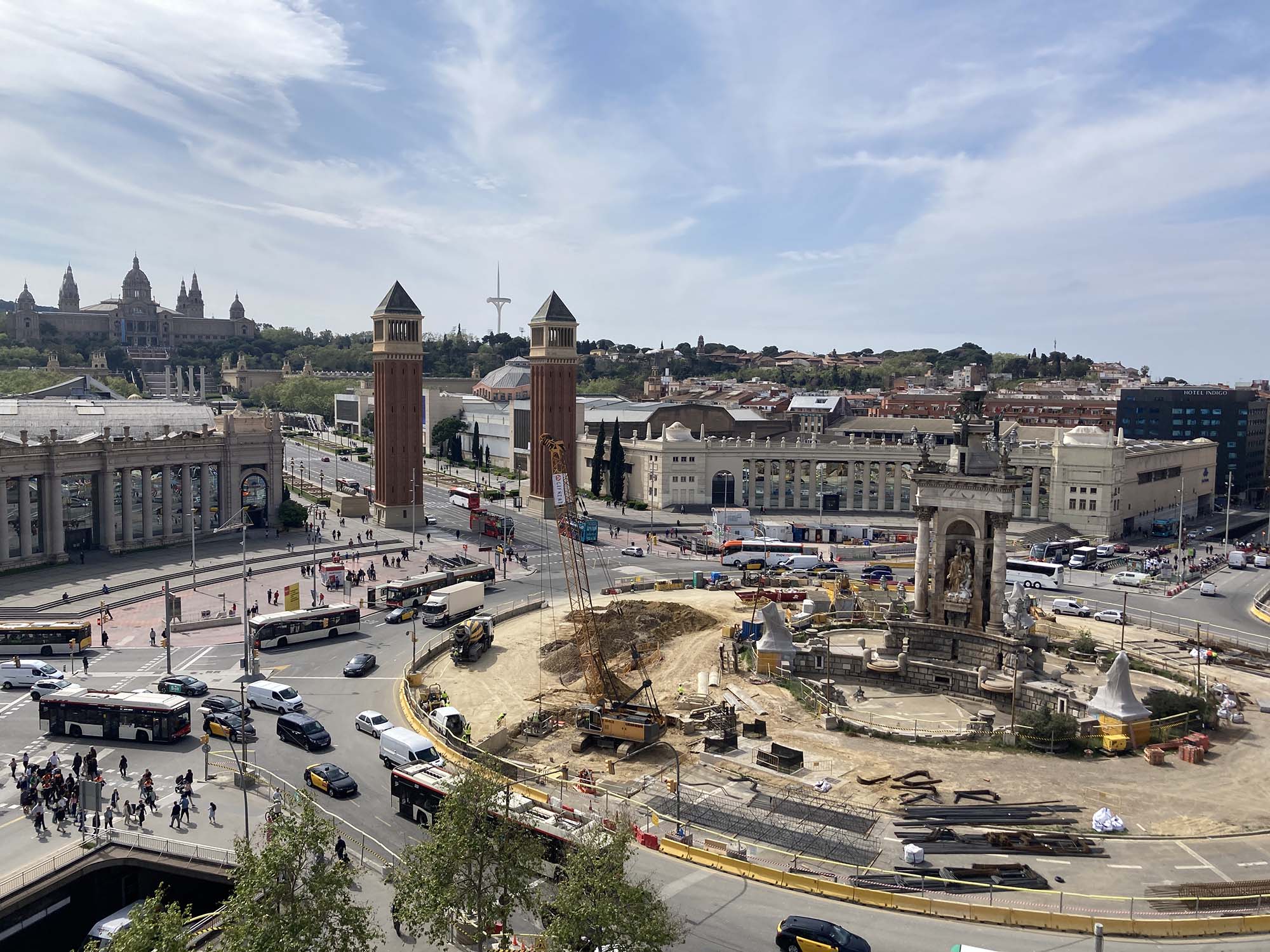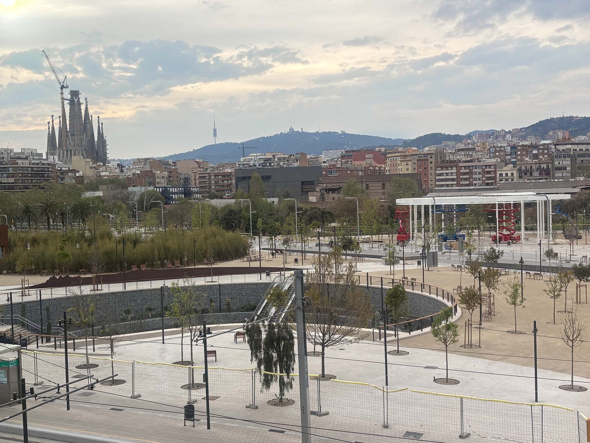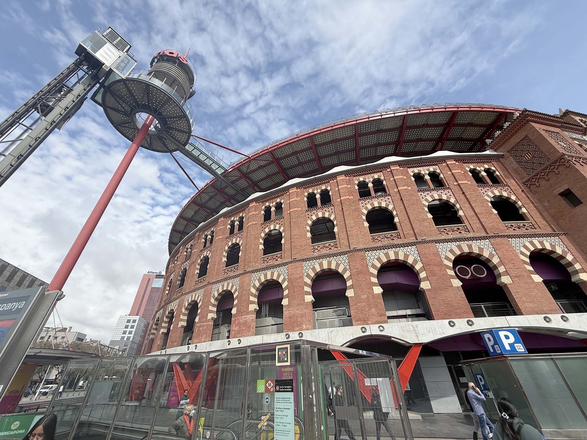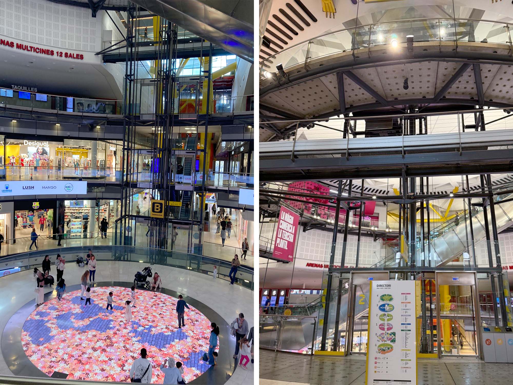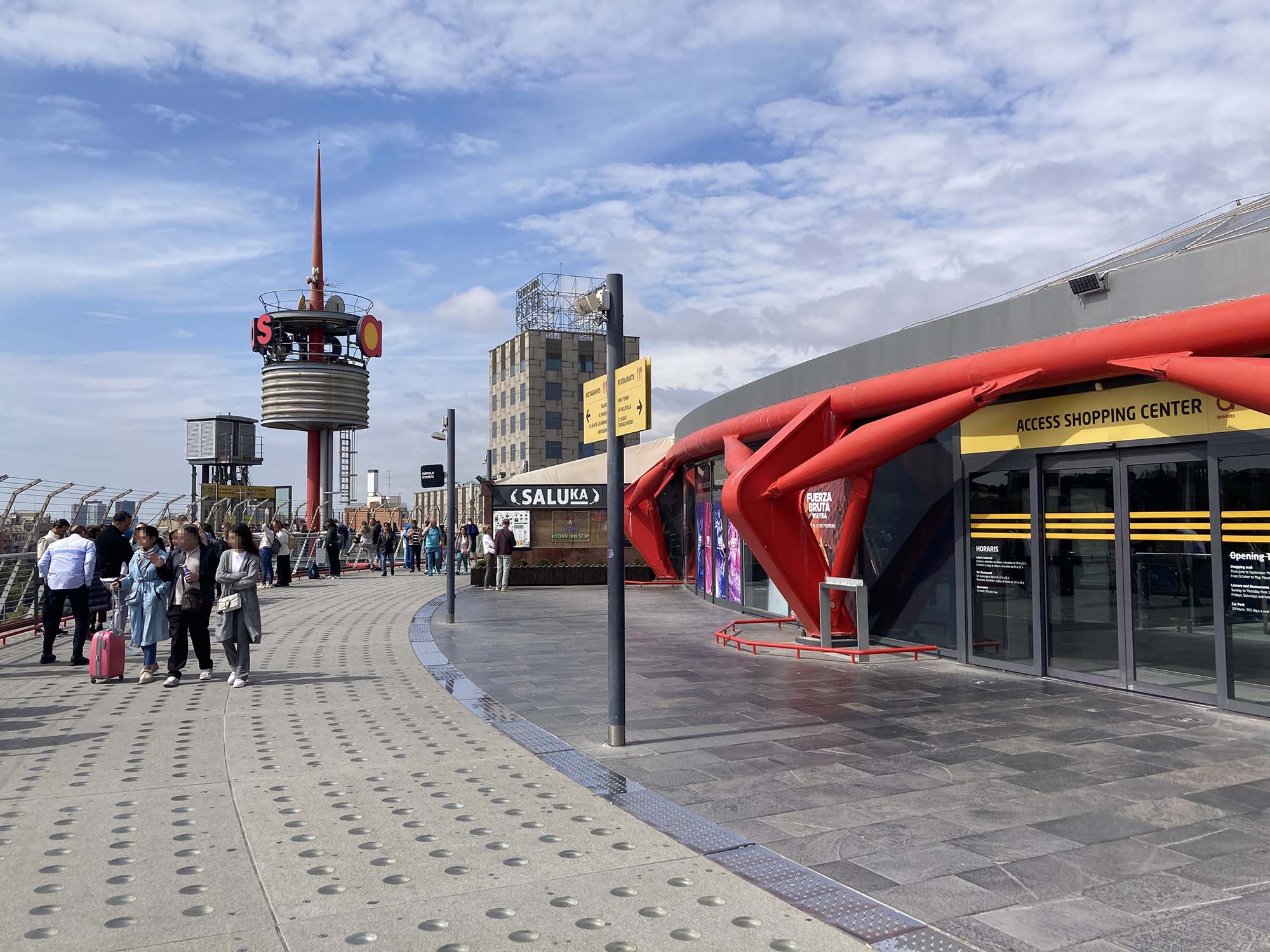 一番目を惹く宇宙船の様なタワーは展望デッキに向かうためのエレベーターです。エレベーターは有料ですが、モールの中からエスカレーターを使えば無料で展望デッキを利用することができます。レトロフューチャーテイストの屋上展望デッキはぐるっと一周歩けるようになっており、バルセロナのさまざまな景色を見ることができます。写真ではスペイン広場がちょうど工事中でしたが、モンジュイックの丘やカタルーニャ美術館、また別角度では遠くにサグラダファミリアも見え、無料とは思えない大満足のロケーションでした。