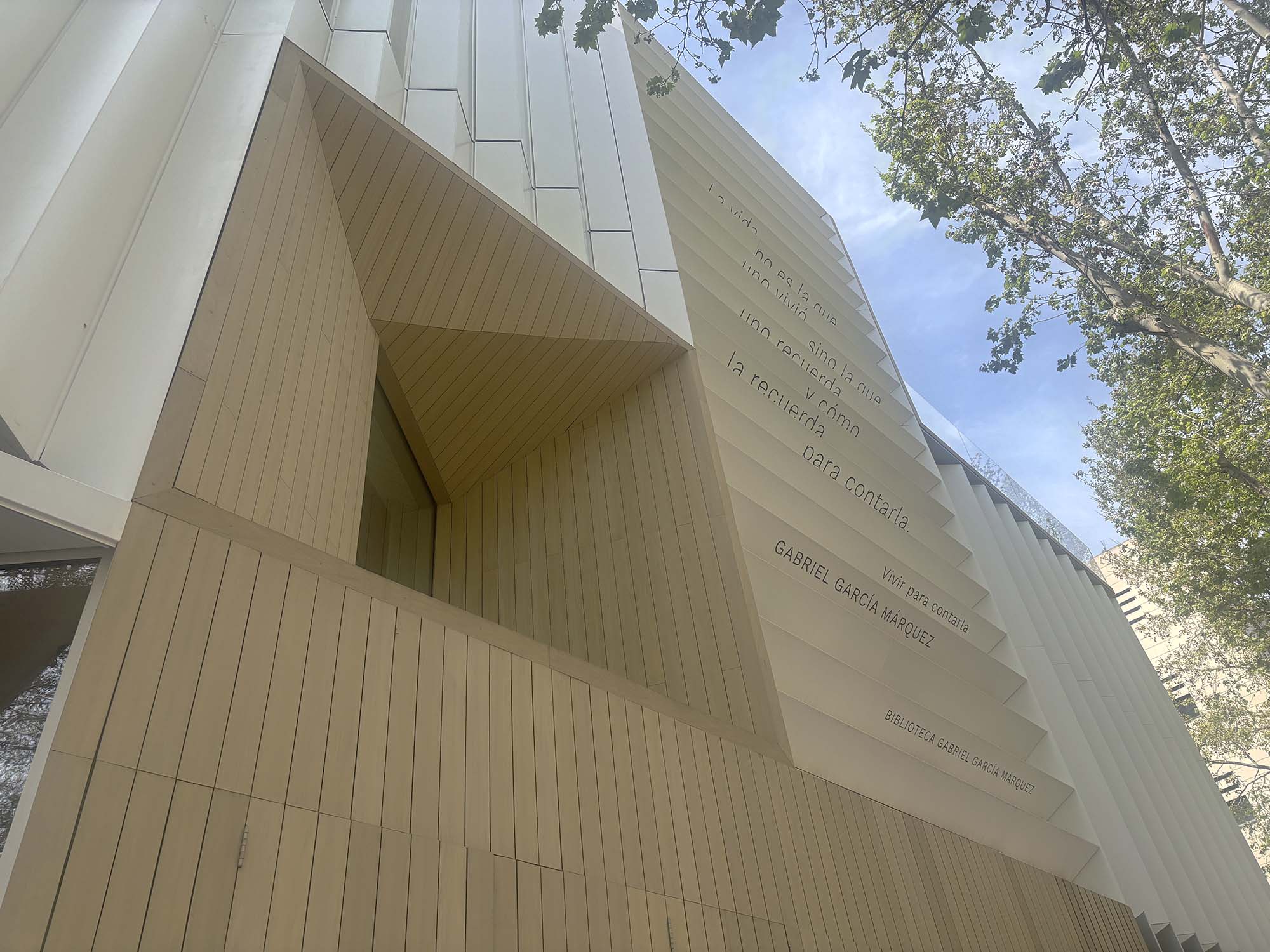 近年、海外・国内ともに図書館の設計デザインの意匠性が向上してきており、バルセロナで注目を集めているGabriel García Márquez Libraryを視察しました。マドリードを拠点に活躍しているStudio SUMA Arquitecturaによる設計で、2022年に開業しています。外観は、開いた本、閉じた本などさまざまな状態の本を積み上げたようなイメージをしていて、空間を断片的に切り取ったような形状をしています。