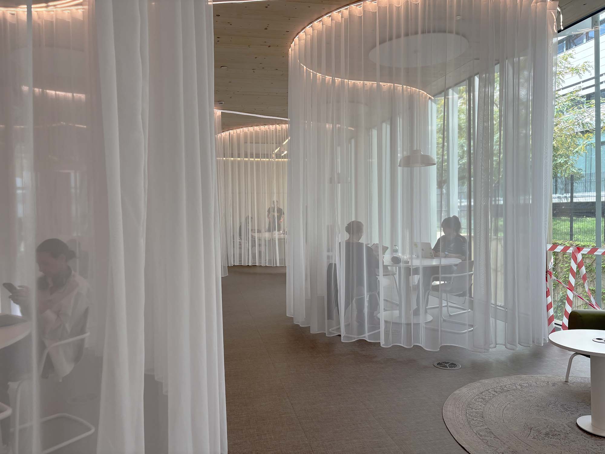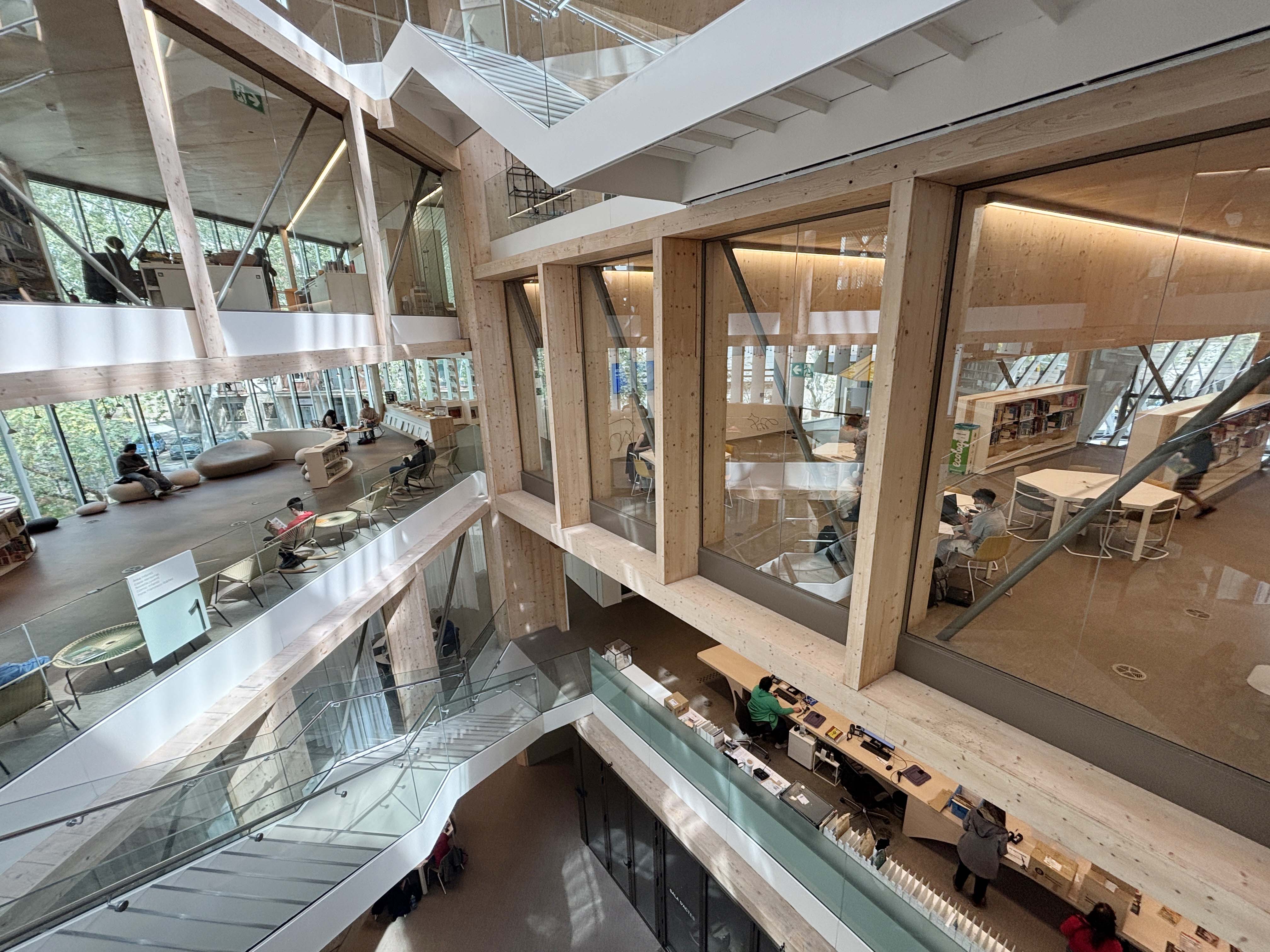 館内も木材が多用され、CLT (クロス・ラミネーティッド・ティンバー)を積極的に使用することで、環境に優しい建築を目指しているそうです。あえて木材の梁や柱を見せるような構造は、まさに本が閉じたり開いている様子を想起させます。館内の中心部にあたる三角形のアトリウムは、夏は自然換気によって冷却効果を生み出し、冬には日光によって空気を暖める効果があるそうです。