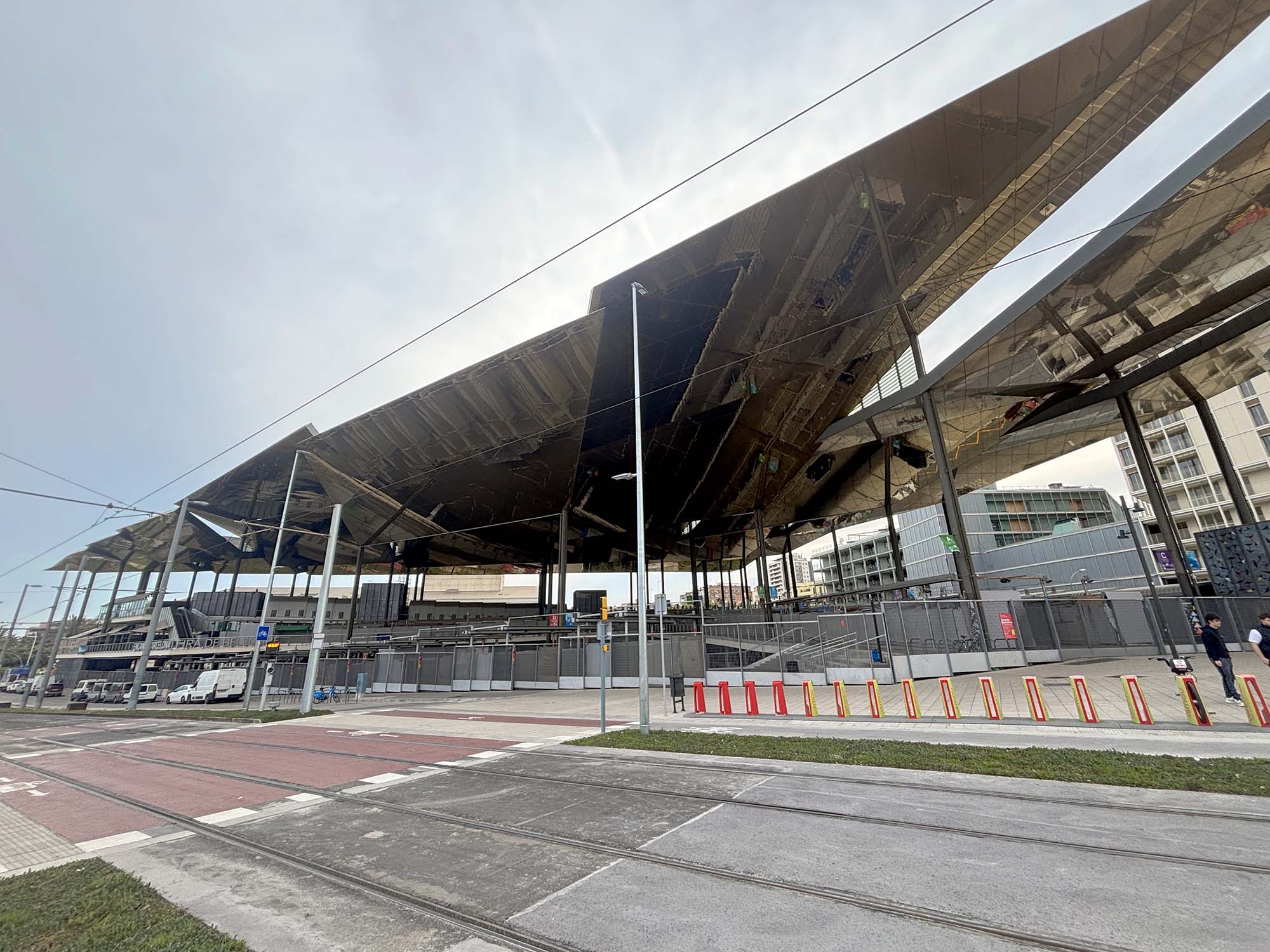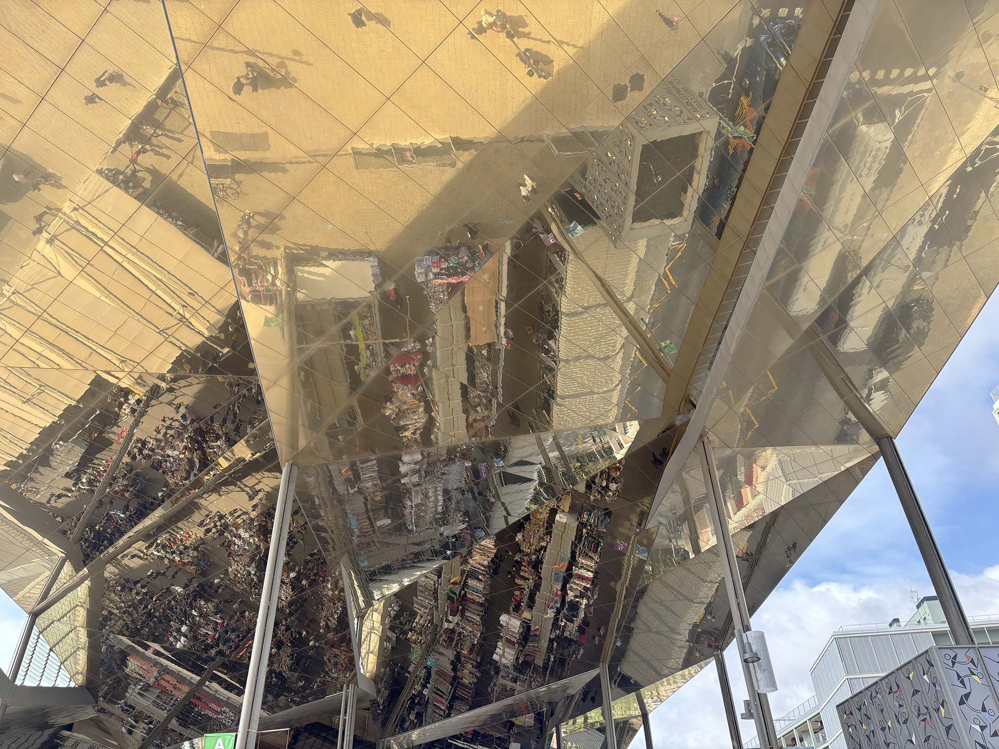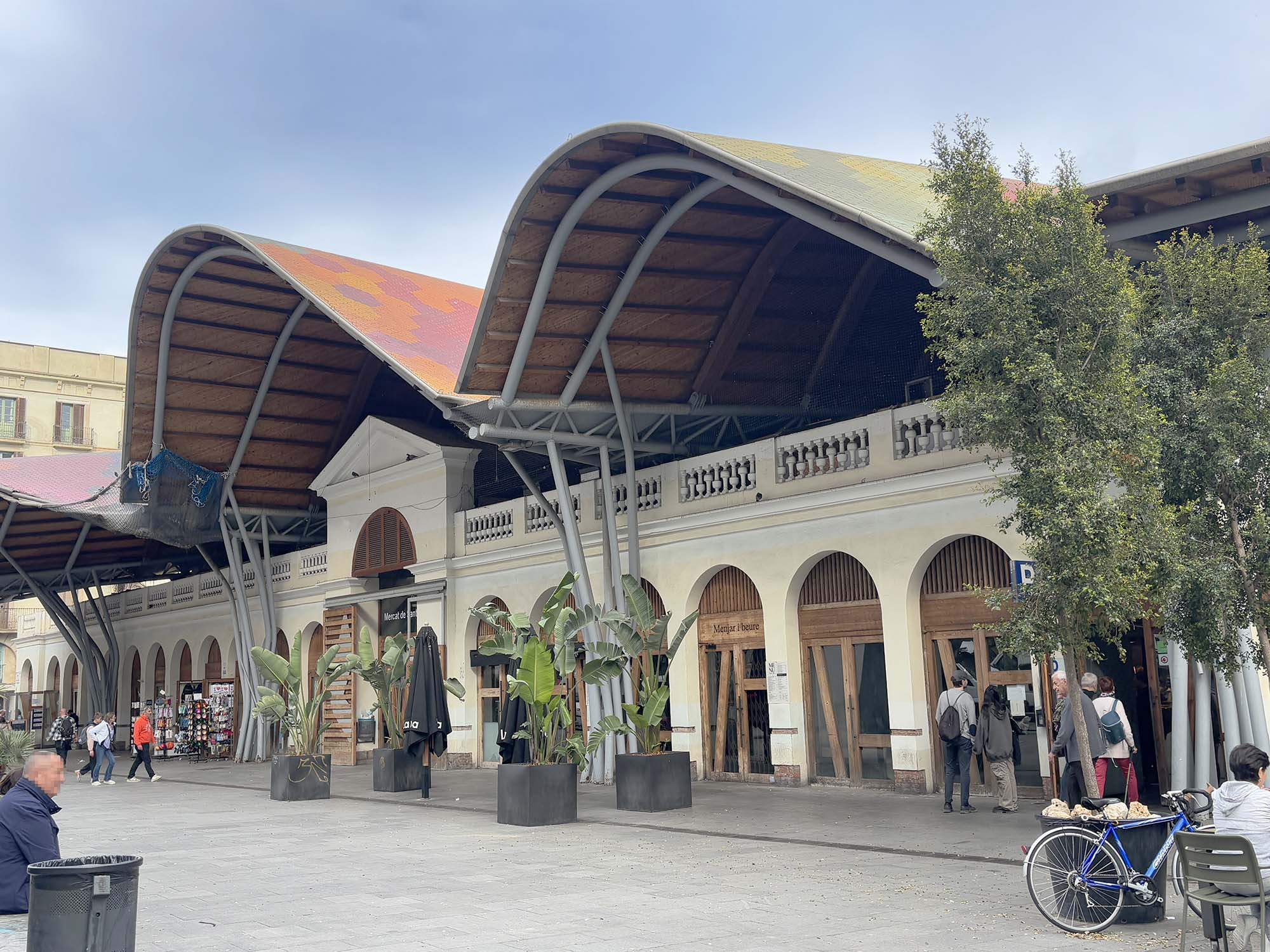 先ほど紹介したグロリエス広場に位置する、鏡張りの天蓋をもつ建築物です。この屋根は、各モデュールが異なる角度で設置されていて、変化する太陽の光や景観を複雑に反射させています。またマーケット内に居る人をも映し出し、さらに賑やかな雰囲気をつくりだしていました。2013年に現在の形に改修が完了し、その設計はアグバー・タワーと同様にB720 Fermin Vazquez Arquitectosが担当しています。