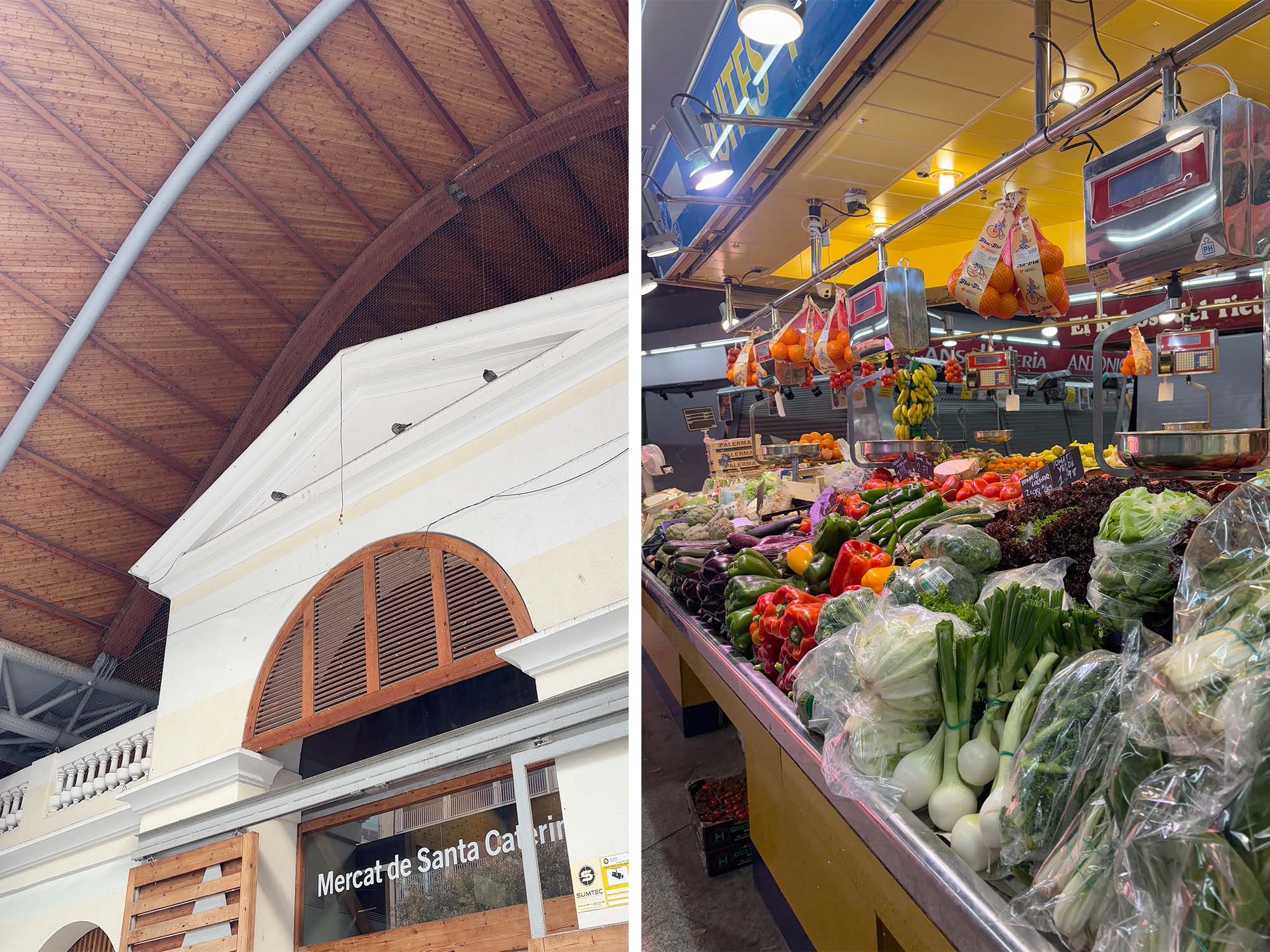 波打つ形状の屋根が特徴のサンタ・カテリナ市場。この屋根は木造建築の構造で、表層はカラフルなセラミックタイルで構成されています。赤、緑、オレンジなどスペインのフレッシュな野菜や果物を想起させるカラーで、67色を組み合わせているそうです。2005年に現在の形に改修され、設計はバルセロナを拠点とするEMBTが担当しています。