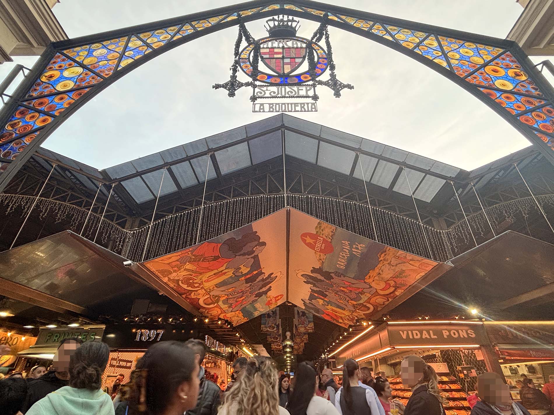 バルセロナの目抜き通り、ランブラス通り沿いにあり、地元の人々から観光客まで連日多くの人が訪れているブケリア市場。1800年代中頃に建てられ、1990年以降に現在の形に改修されたそうです。アイコン的存在である、エントランスのゲートは鉄製の枠にカラフルなガラスとセラミックタイルのトレンカディスで構成されています。(トレンカディスの説明は、コラムの前編をご覧ください。)