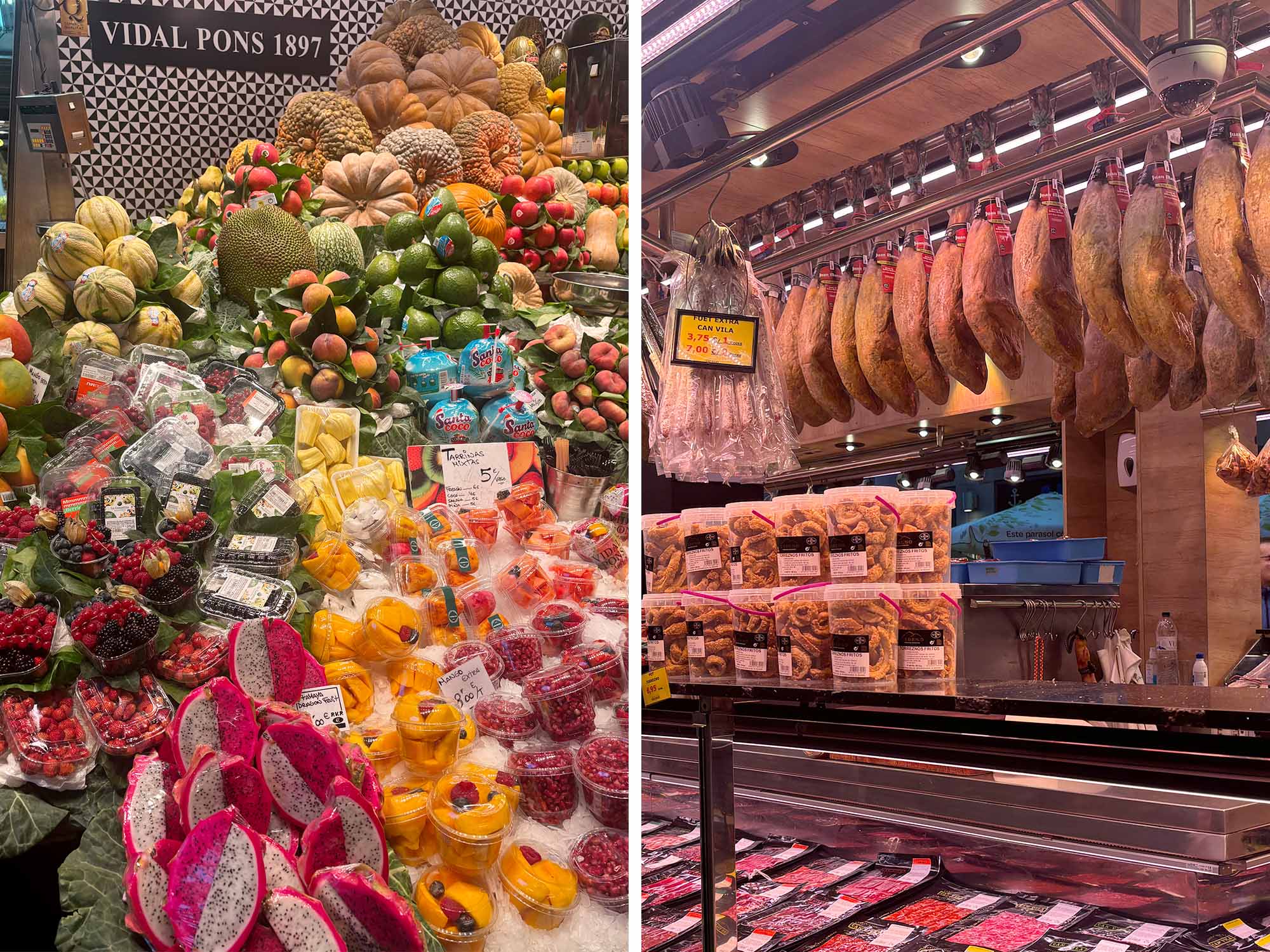 エンカンツ蚤の市は日用品や古着、サンタ・カテリナ市場は食品を主に扱っていて、どちらかというと地元の人でにぎわっていました。一方で、ブケリア市場はバルセロナの中心地ということもあり、観光客も多かったです。カラフルでフレッシュな果物や野菜、大胆にぶら下げられた生ハムの原木、新鮮な海鮮など見ているだけでも楽しい気分になりました。スペインの台所から、スペインならではの力強く華やかな色彩感覚を学びました