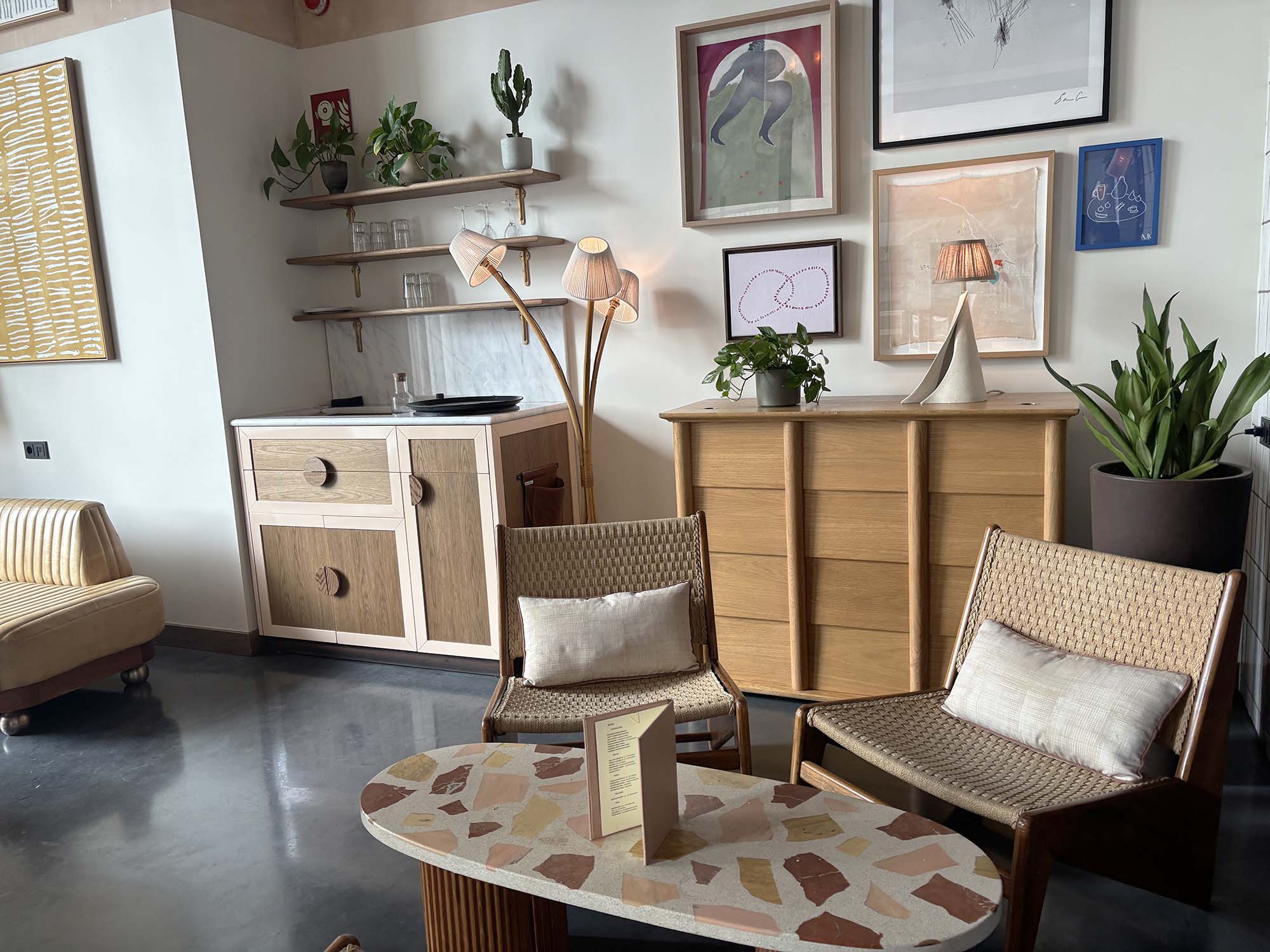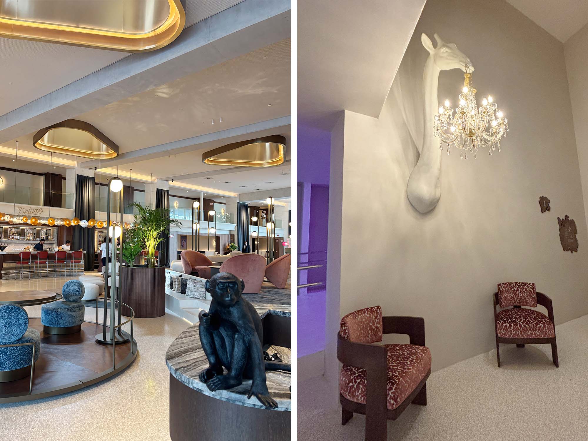 さらに、斜めに設えられたシャンデリアや、猿やキリンをモチーフにした照明など、個性的なアイテムが空間を彩っています。床材にはグレーとホワイトのテラゾーが使われ、垂直面にはウォールナットの木材が使用されています。インテリア全体は比較的シンプルな構成となっており、ユニークな家具や照明といった要素が際立つデザインです。