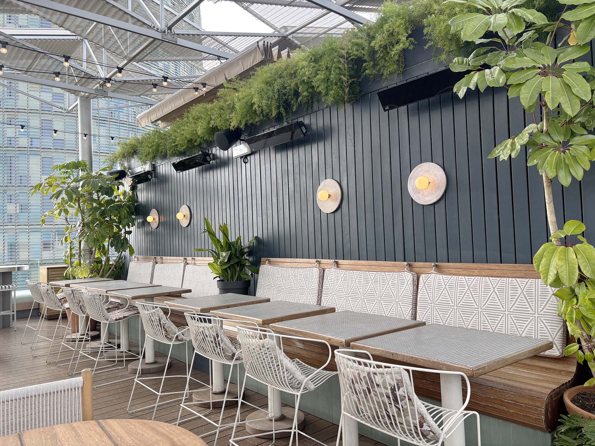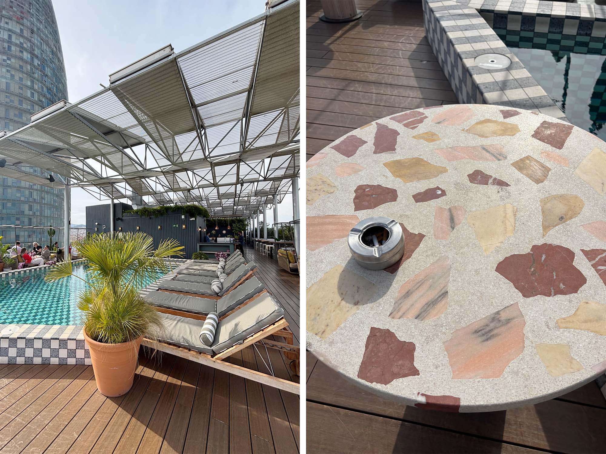 ルーフトップにはプールとバーがあります。アウトドアスペースも家具にこだわりが見られます。プールサイドにはサンラウンジャーやカバナがあり、ゲストは日光浴を楽しんでいました。
