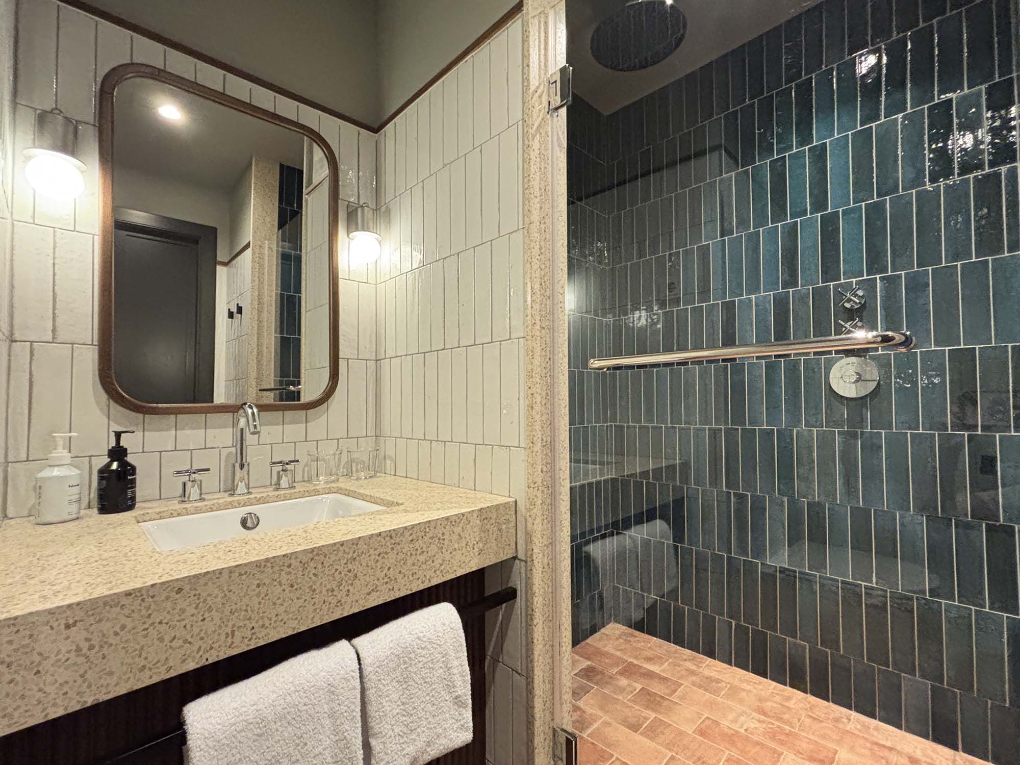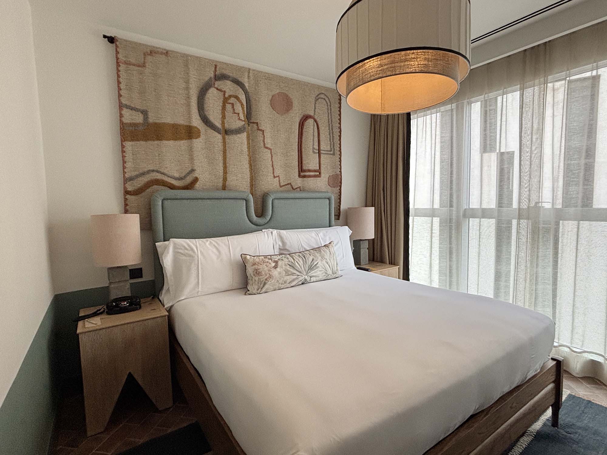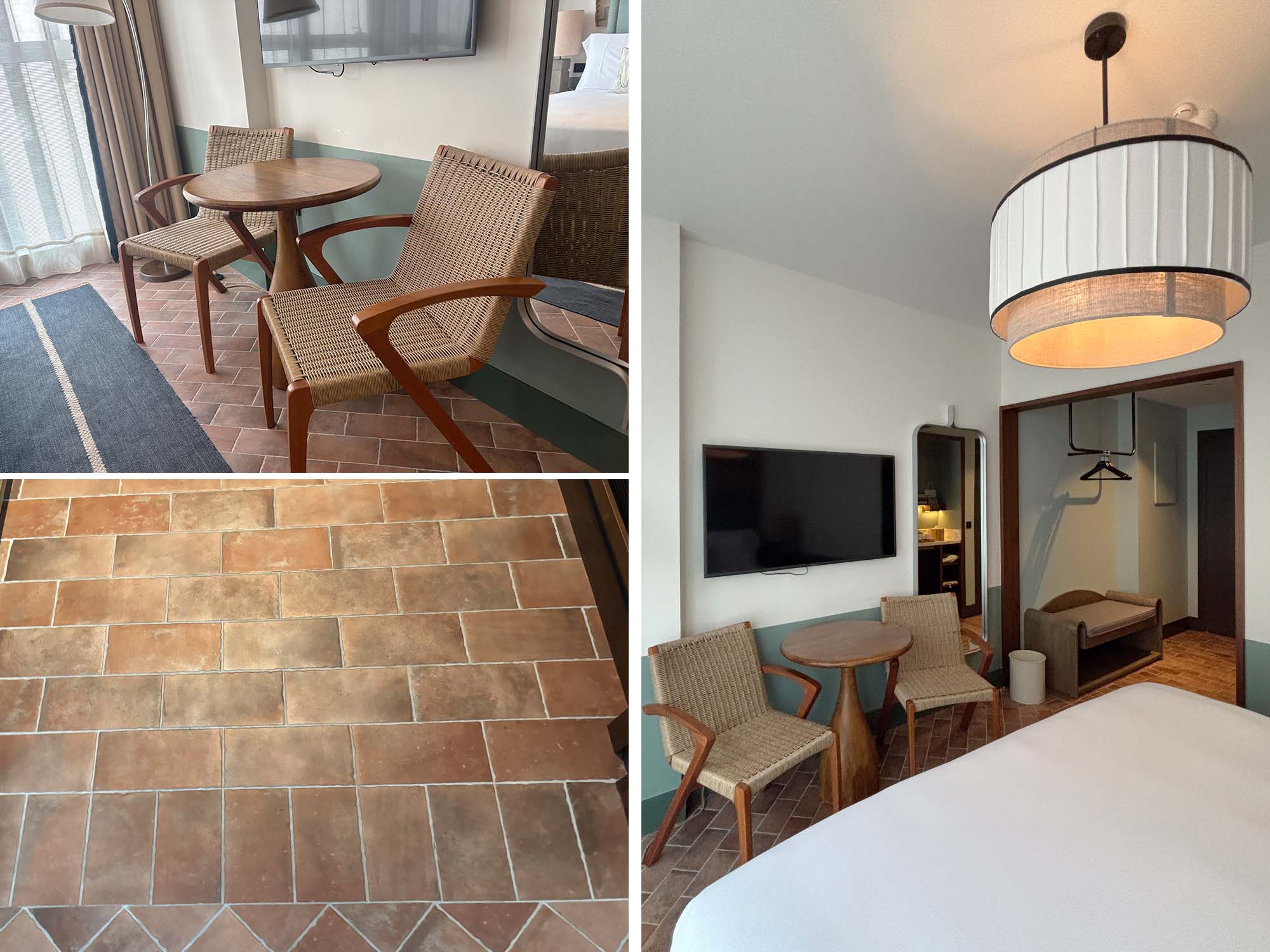 客室もロビーエリア同様に、地中海に面した家をイメージしたデザインになっています。フロアはテラコッタのタイルで構成され、ベッドルームと玄関スペースでタイルの貼り方を変えることで、ゆるやかにシーンを仕切っているように感じました。そのほかベージュやブラウンの木材や、麻、籐といった素材感豊かなインテリアで構成されており、グリーンに塗装された腰壁が空間に爽やかなアクセントを与えています。