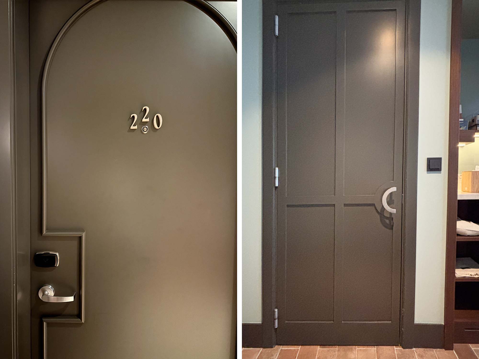 バスルームにつながる建具はブラウンに塗装された面材を使用し、レバーハンドルの形状に合わせて中桟も半月を描いています。バスルームの壁面は深みのあるグリーンカラーとホワイトカラーのタイル、洗面はイエローやオレンジカラーの骨材が入ったテラゾーで構成されています。客室扉も、インテリアの曲線を活かしたデザインでした。