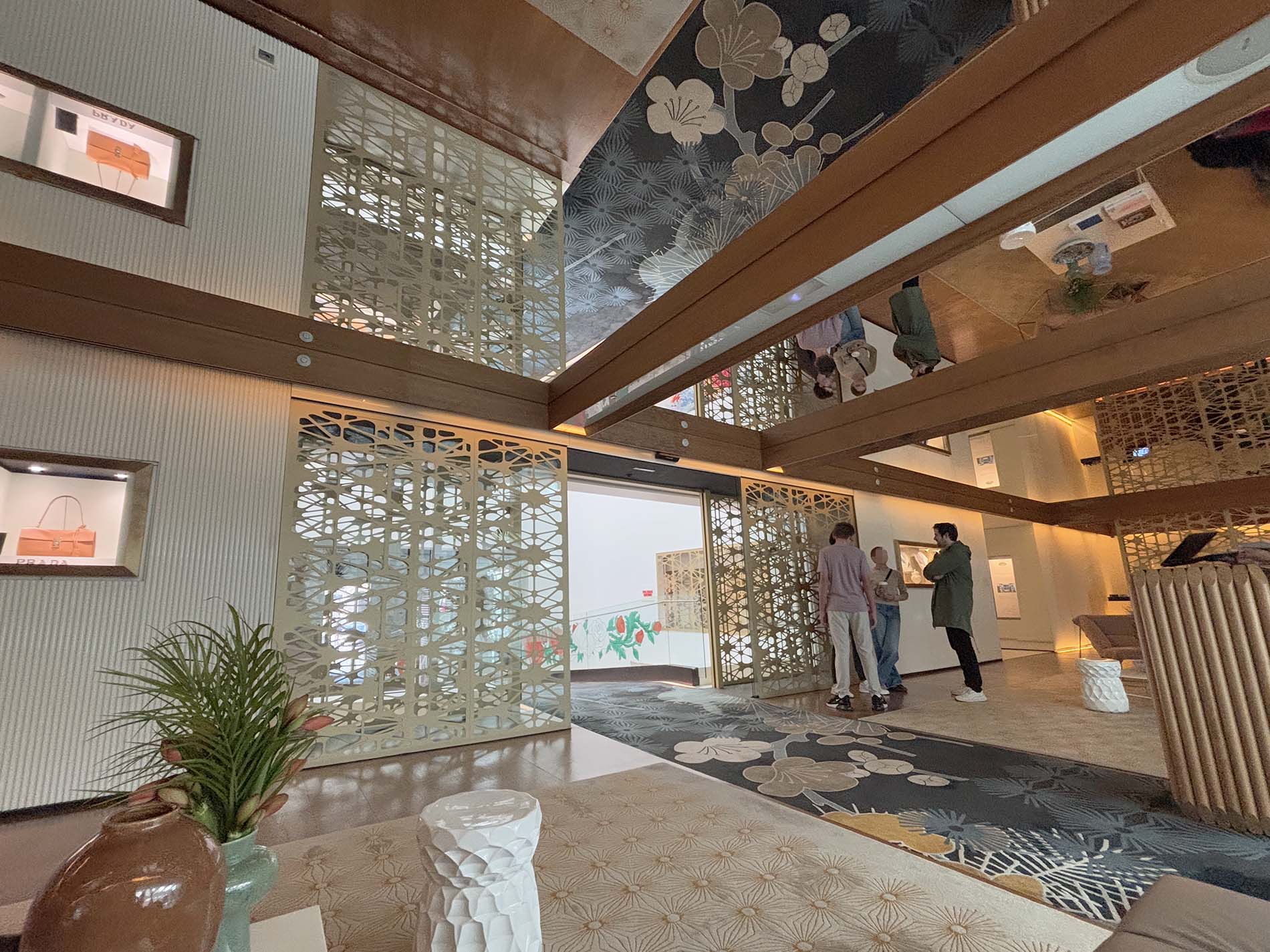 ロビーフロアからは、下の階にあるレストランを見下ろすことができます。壁面や天井から吊り下げられる形で、幾何学模様に切り抜かれたメタル製の装飾が空間を彩り、視線をゆるやかに制御しています。視線をさえぎりながらも空間のつながりを保つというデザイン意図があるそうです。ラグにはブランドイメージであるオリエンタルな雰囲気を感じさせるアジアンテイストの花が描かれています。また、ロビーの天井にはミラーが施されており、その反射によって空間が上下に広がって見え、実際よりも天井が高く感じられました。