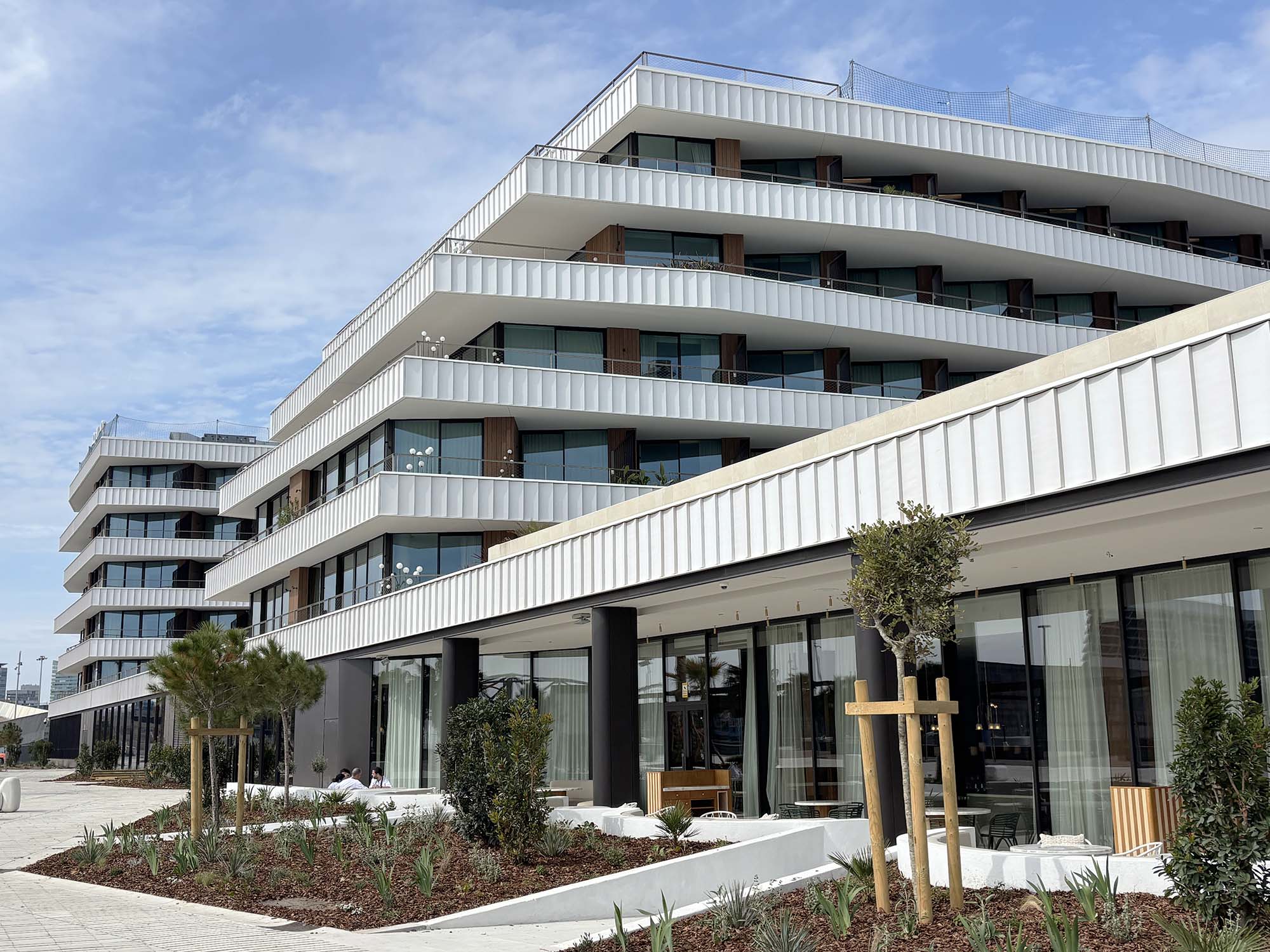 続いてご紹介するのは、現在再開発が進められているバルセロナ北東部に位置する、 SLS Barcelona です。このエリアはもともと工業地帯でしたが、現在では複合用途の都市開発地区として再整備が進行中です。SLS Barcelonaは2024年12月に開業した新しいリゾートホテルで、設計はアグバー・タワー、エンカンツ蚤の市と同様にb720 Fermín Vázquez Arquitectos、インテリアはRockwell Groupなどが担当しています。