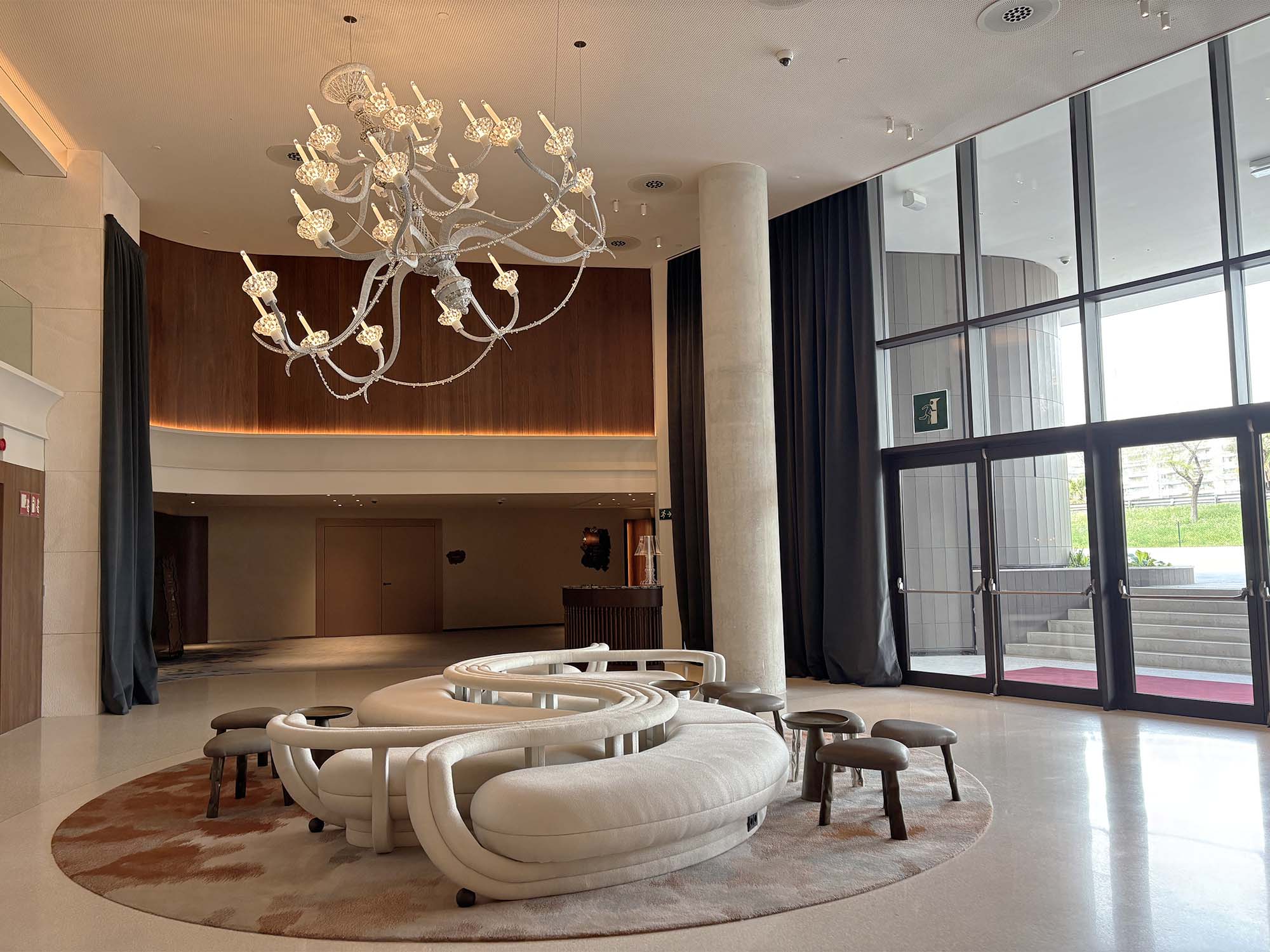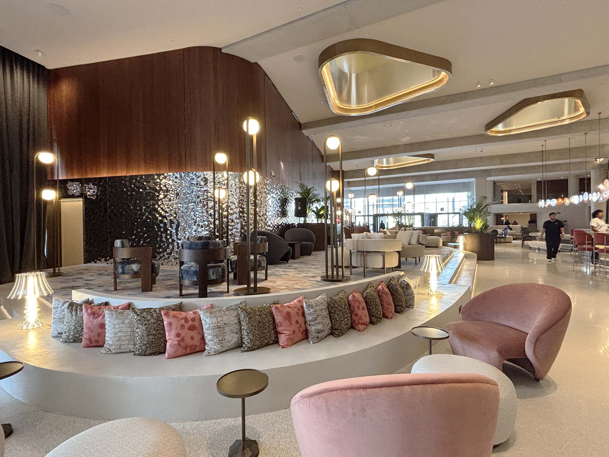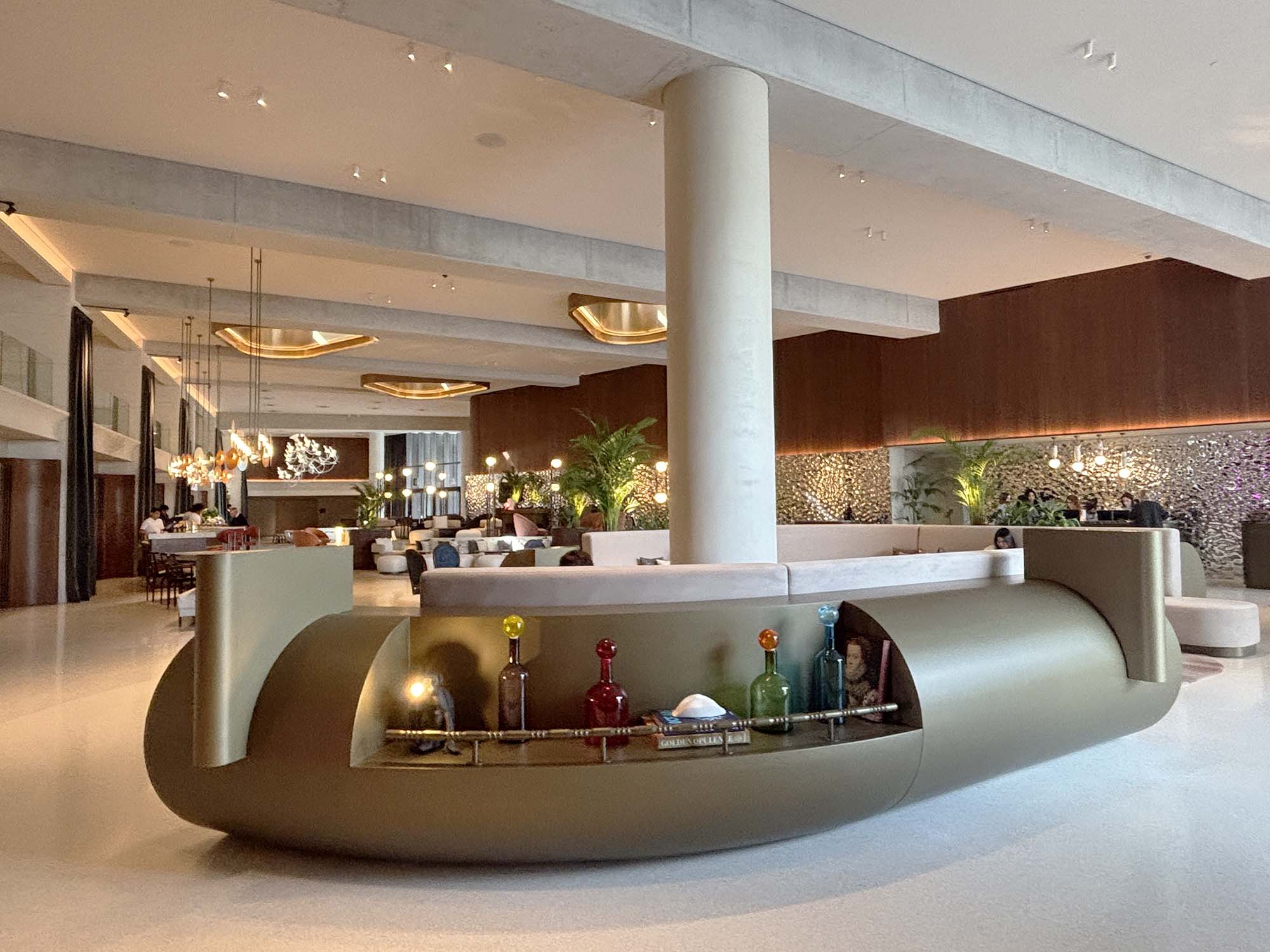 ホテル内に入ると、曲線美と金属素材のきらめきに包み込まれます。特に、壁面には波打つテクスチャーの金属パネル、天井の装飾にも金属素材が使われていて、豪華なインテリアになっています。家具もモダンなものからクラシカルな印象のものまで多様なテイストを織り交ぜています。