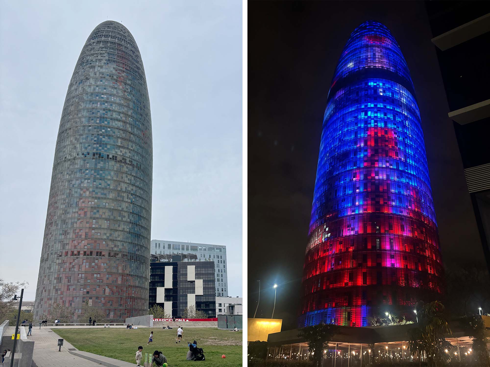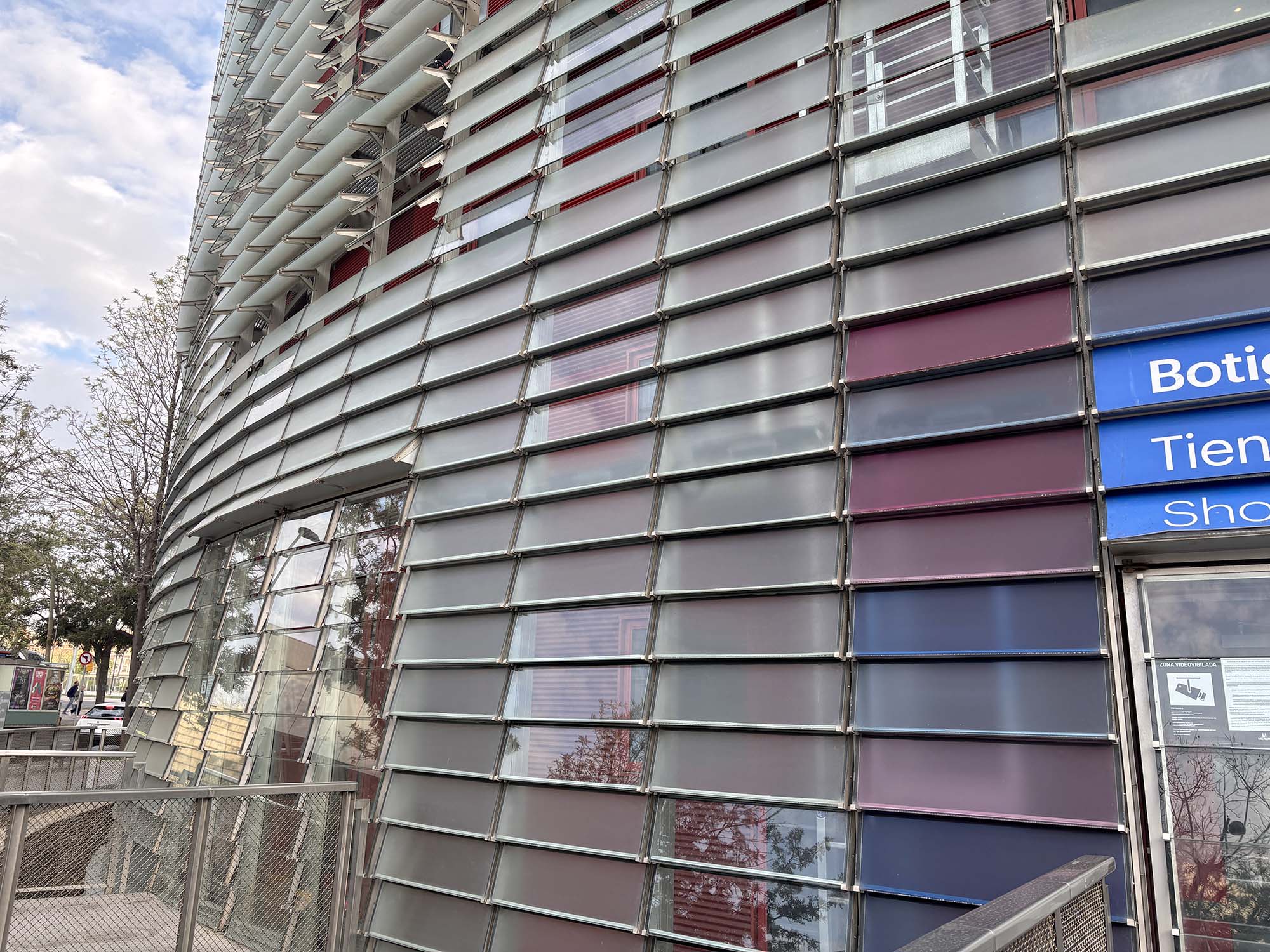 グロリエス広場(グロリアス広場)に位置する高さ142m、35階建てのこのタワーは、バルセロナで最も高さのある建築物です。バルセロナを拠点とするb720 Fermín Vázquez Arquitectosの設計で、2005年に完成しました。スペインのモンセラート山脈からインスピレーションを受けた造形をしており、鉄筋コンクリートをベースに、表面は50000枚を超えるガラスで構成されているそうです。低層階の赤いガラスはマグマが作り出す地形をイメージし、上層階に行くと水を想起させるブルーが使われています。近づいて建物を見ると、無数の窓がみられます。外界の温度を感知し、ブラインドを開閉することで、建物内の空調を調整しているそうです。
