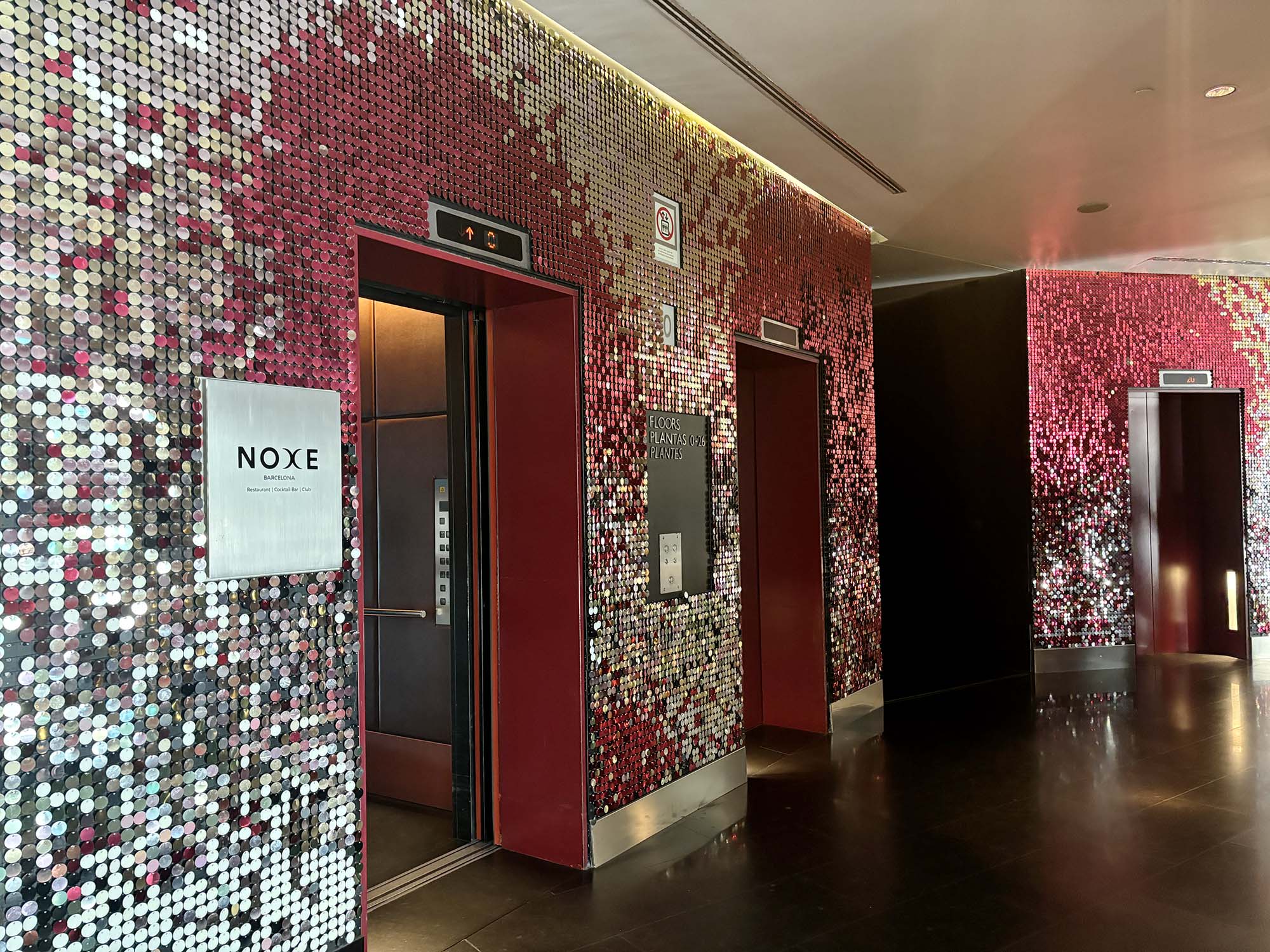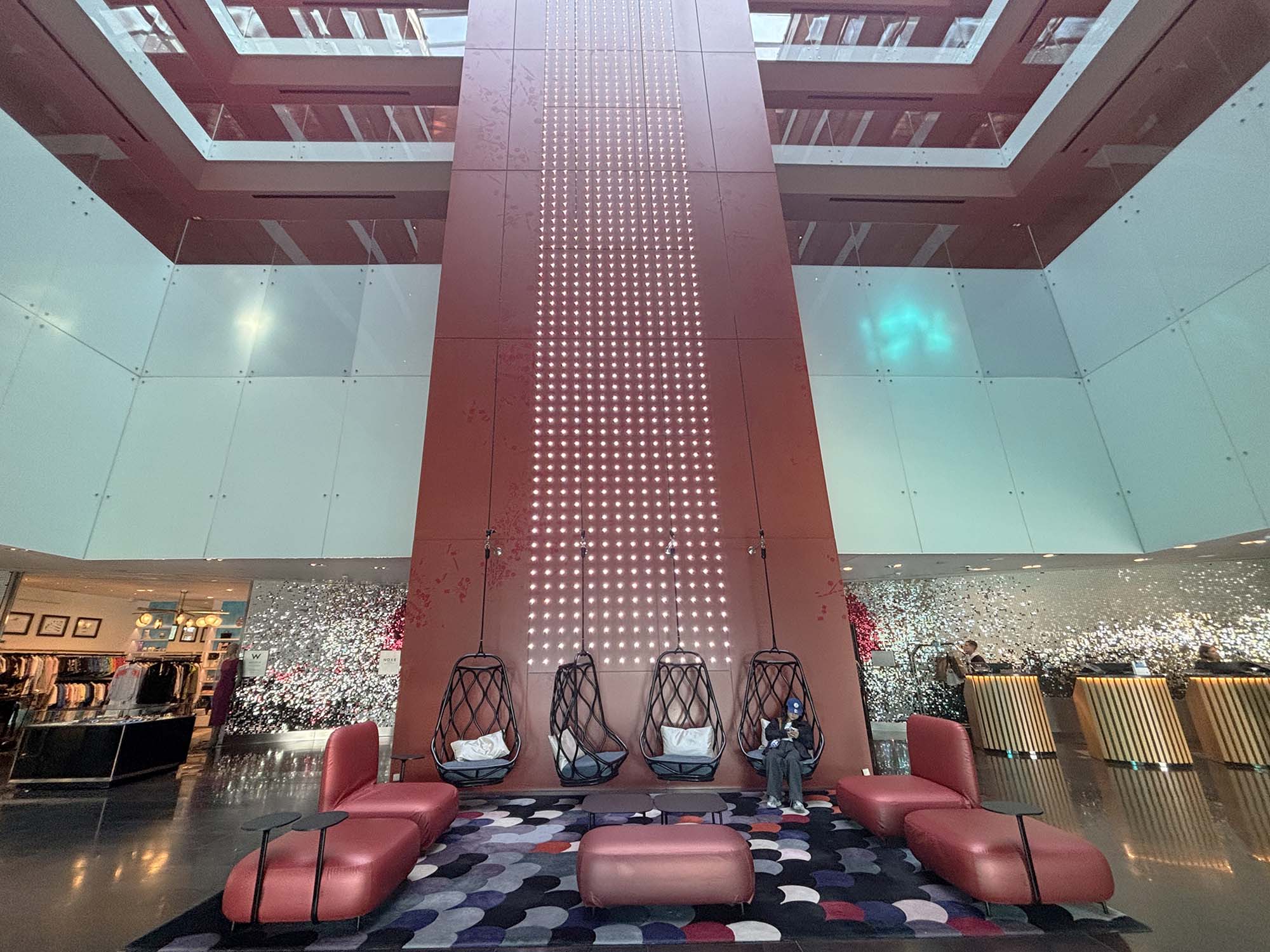 ホテルに内に入ると、深みのある赤を取り入れた華やかな空間が広がります。赤の壁面が、アトリウムの天井まで設えられ、目線を上に誘導し、空間をより広く感じさせています。またエレベーターホールの壁面はスパンコールのようなきらめきのあるシルバーとレッドの金属プレートが人や風によってなびき、ギラギラと輝いていました。