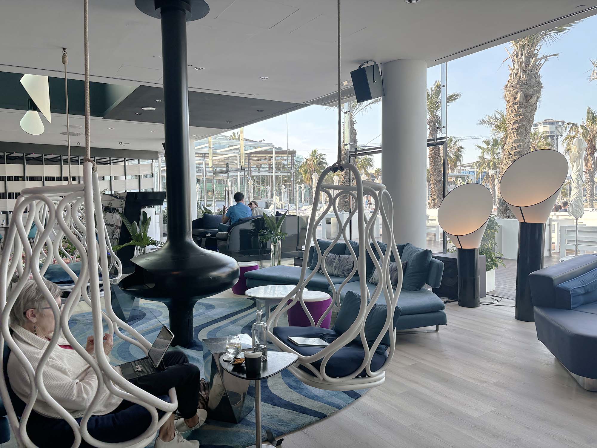 ラウンジは地中海を想起させるブルーをベースに、個性的なインテリアが彩りを与えています。遊び心を感じさせるデザインは、豪華客船の社交の場を想起させます。ハンギングチェアはバレンシアで創業した家具ブランドExpormimの製品だそうです。