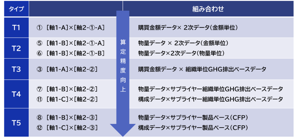 ただし、必ずしもT1→T2→T3→T4→T5の順に進む必要はありません。取引構造やサプライヤーのデータ提供状況によっては、T1からT5へ直接移行するケースもあります。重要なのは、「現状どのタイプで算定しているか」「今後どのタイプを目指すか」を整理し、精度向上の方向性を明確にすることです。