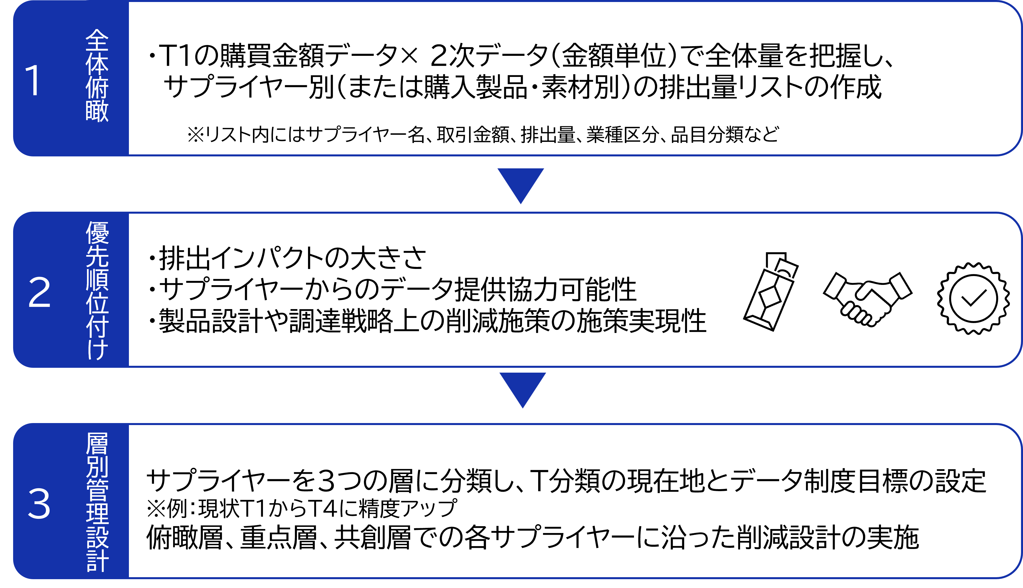 重点層に対しては、現状がT1の場合、まずはT2「物量データ ×2次データ(金額単位)と物量データ ×2次データ(物量単位)」へ移行を検討します。購買金額データを単価で補正して物量に換算し、物量単位の2次データ係数を適用することで、価格変動の影響を排除し、材質別の比較が可能になります。並行して、サプライヤーとの対話を通じて、サプライヤー組織単位GHG排出ベースデータの提供可能性を探ります。提供が可能な場合は、T3やT4への移行を検討します。