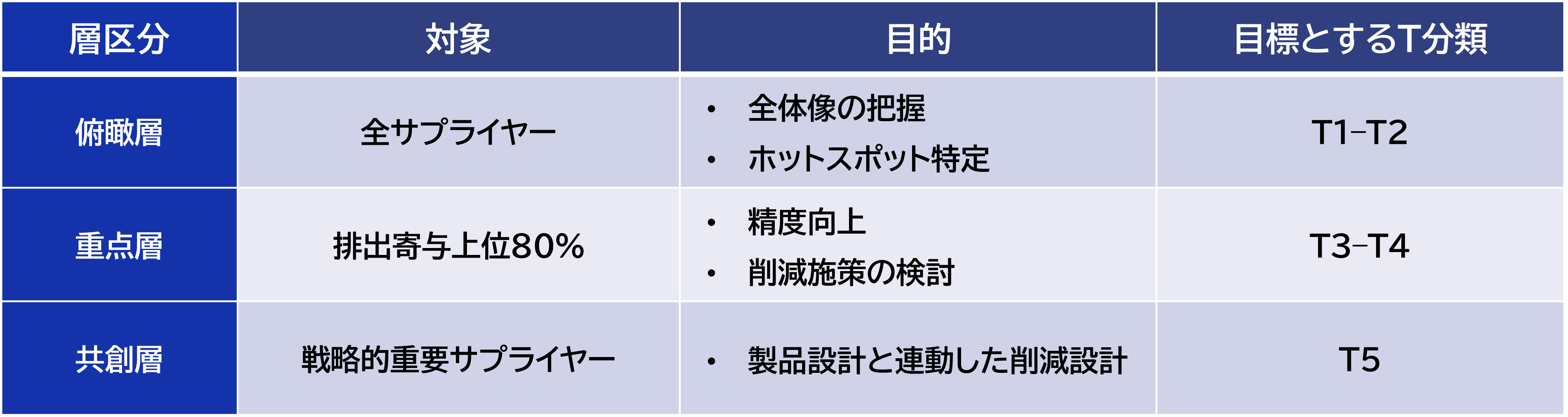 共創層に対しては、製品設計や調達戦略と連動した削減設計を目指します。サプライヤーとの協議を通じて、製品CFPの算定や提供を依頼し、T5への移行を目指します。