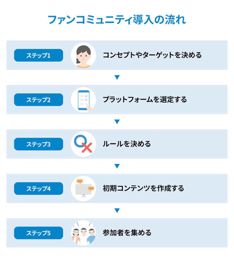 ファンコミュニティを導入する5つの流れは下記のとおりです。