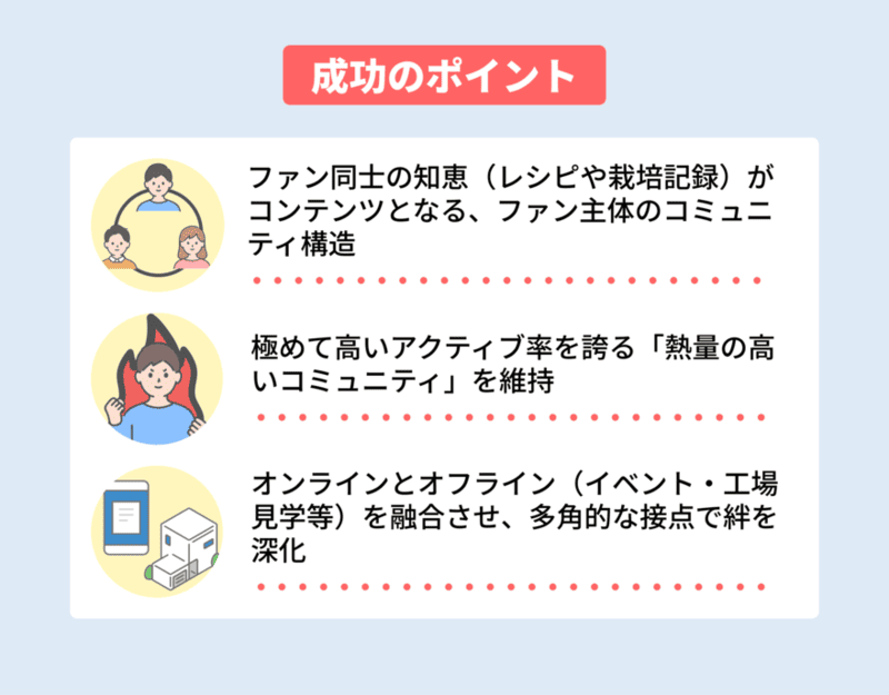 さらに、新商品の試食会や工場見学といったオフライン施策も組み合わせることで、ファンを単なる消費者ではなく、ブランドとともに価値を創る「共創者」として位置付けています。