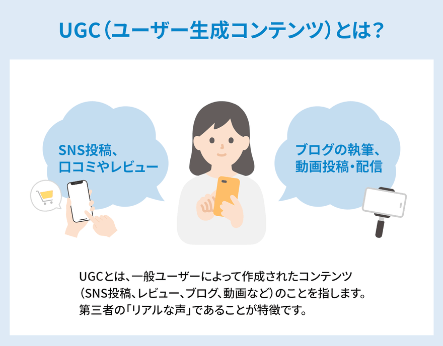 UGCとは、一般ユーザーによって作成されたコンテンツ(SNS投稿、レビュー、ブログ、動画など)のことを指します。第三者の「リアルな声」であることが特徴です。