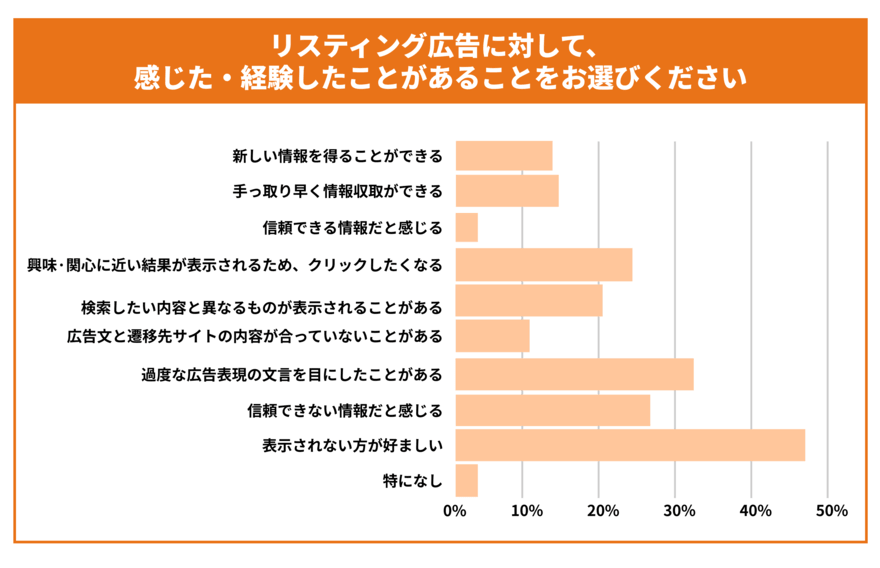株式会社ニュートラルワークスの調査によると、企業側が発信する広告(リスティング広告)に対し、全体の45.6%の人が「表示されない方が好ましい」、25.6%の人が「信頼できない情報だと感じる」と回答しています。