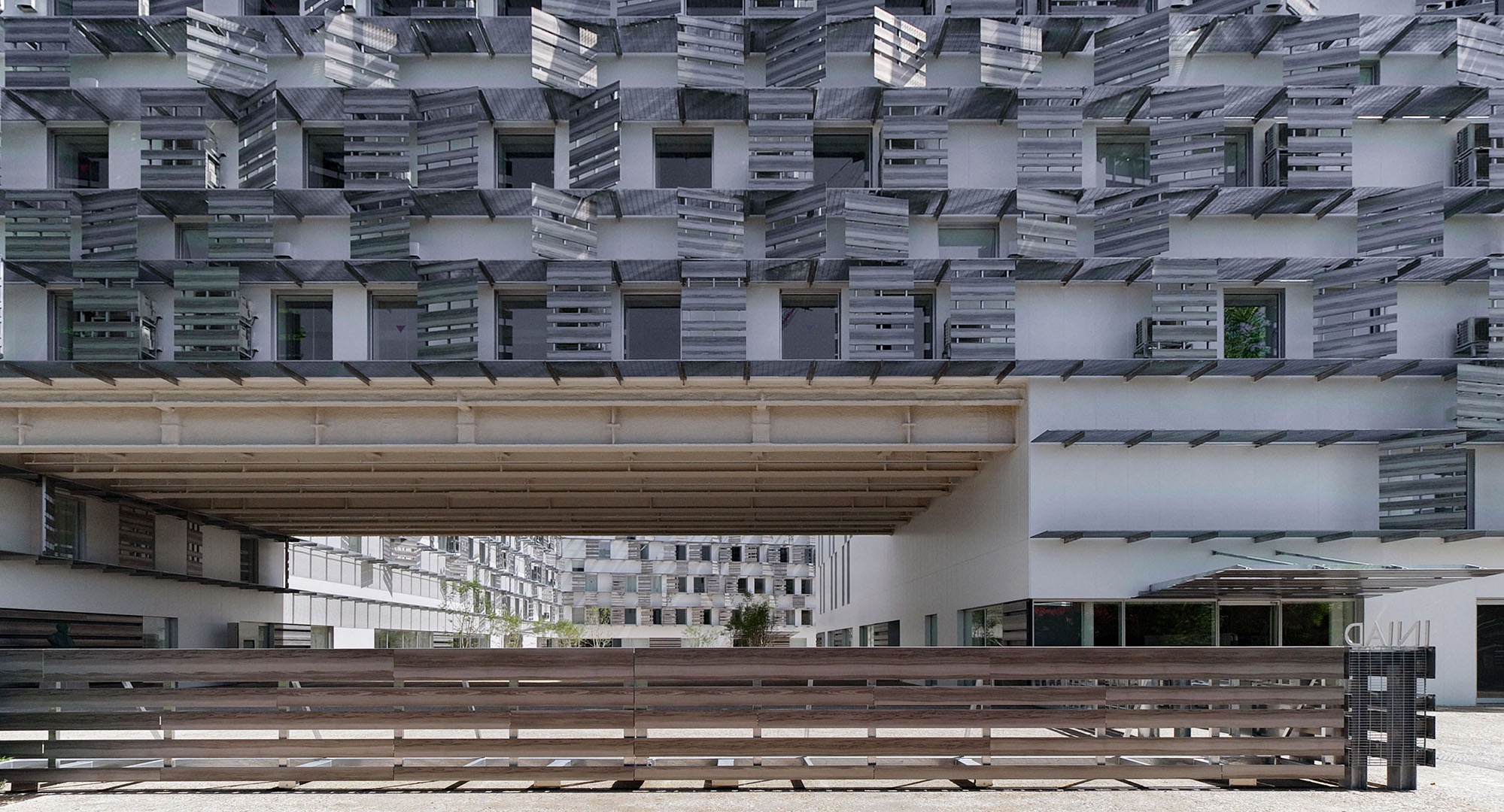 そのなかでアートテックは窓の開口部に採用されています。アルミエキスパンドメタルと組み合わせたランダムな開口部が、深い陰影と「街並み」のようなリズムを生み出しています。素材であるアルミの素地を生かした表現と自然光による景観の変化が、学生の感性を刺激する空間を作り上げました。