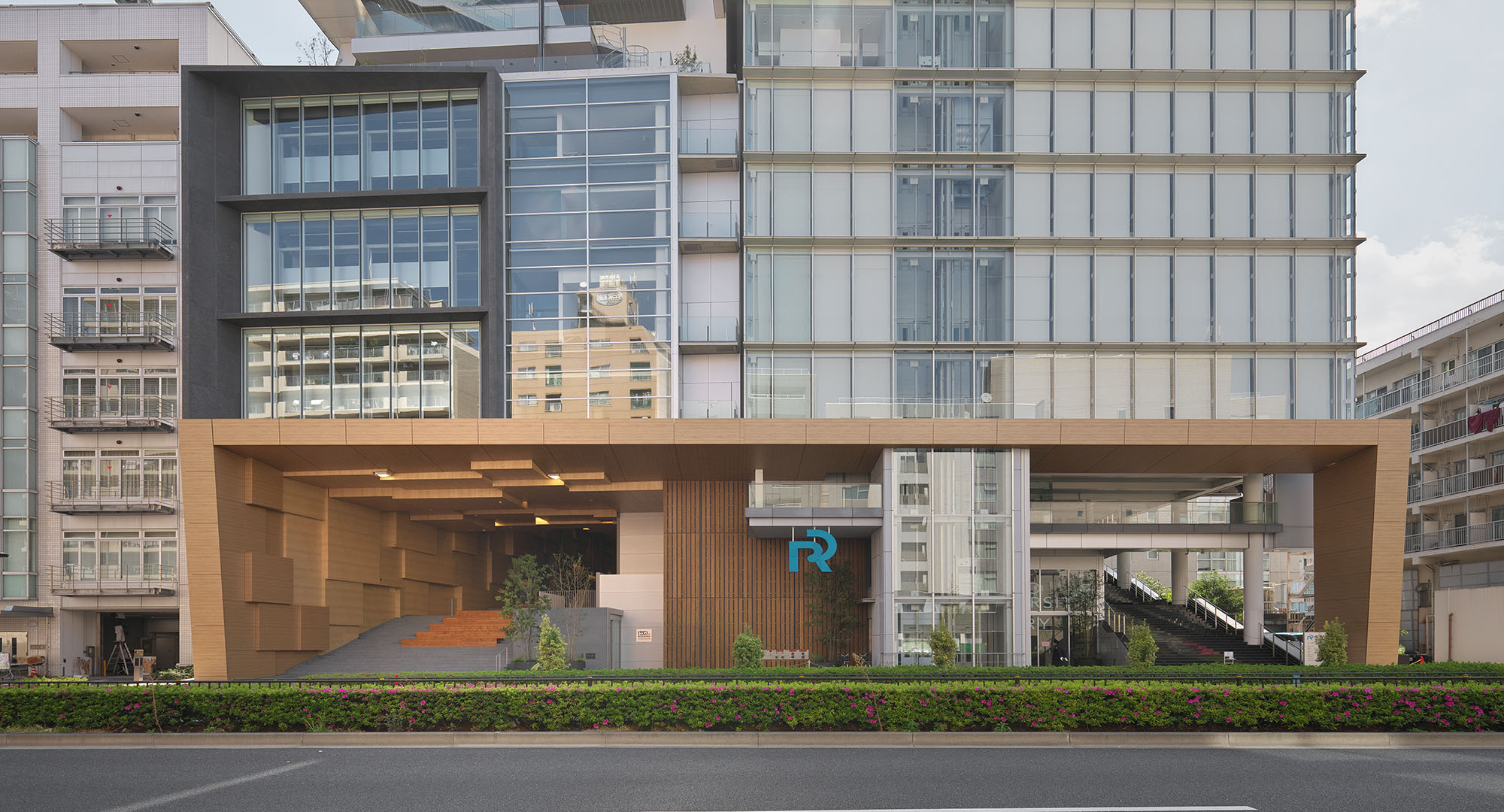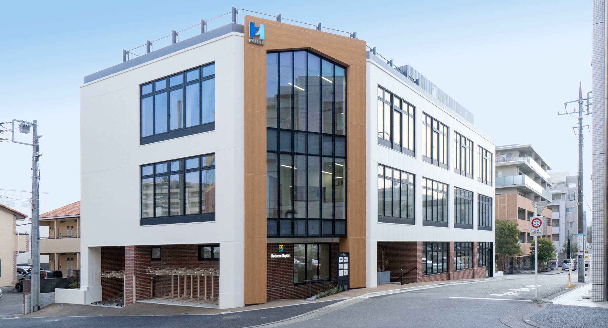 外観には、誰もが一目で「こどもでぱーと」と認識できる「家型」のアイコニックなデザインが取り入れられています。また、歩行者の目線となる低層部のエントランス周りには、植栽とともに木目柄のアートテックを配置しました。象徴的な門構えに豊かな木質感を与えることで、訪れる親子を優しく迎え入れる居心地の良い空間を作り出しています。