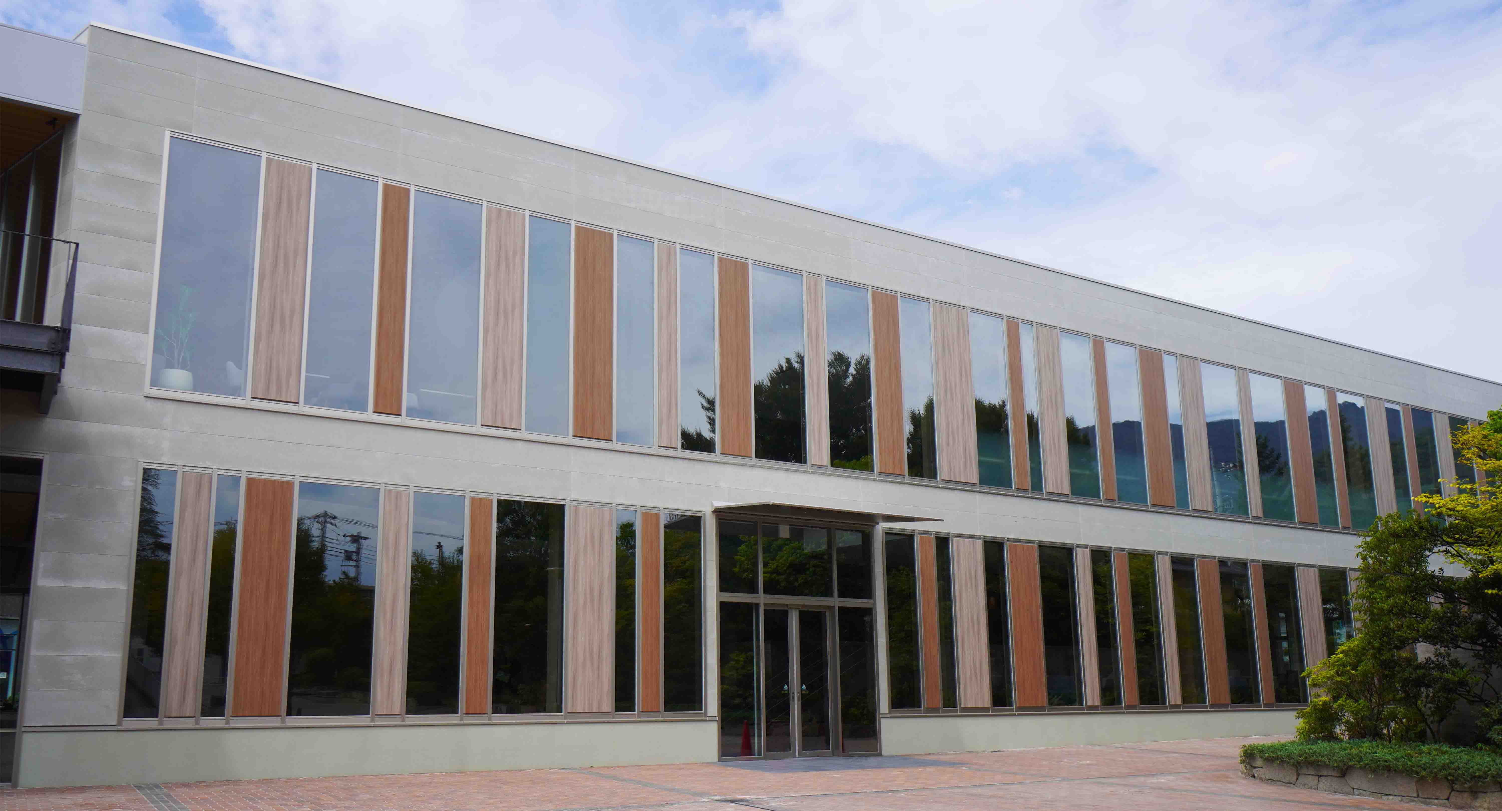 「食とコミュニケーションと学びの場」をコンセプトにした新食堂棟では、大きな庇(ひさし)の下に開放的なテラス席が設けられています。ここでは既存建物との調和を図りつつ、温かみのあるデザインを実現するために、ガラスパネルとの組み合わせで木目柄のアートテックが導入されました。
