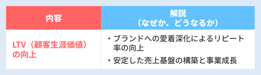 | LTV(顧客生涯価値)の向上 | ・ブランドへのロイヤルティ(愛着)深化によるリピート率の向上 ・安定した売上基盤の構築と事業成長 |