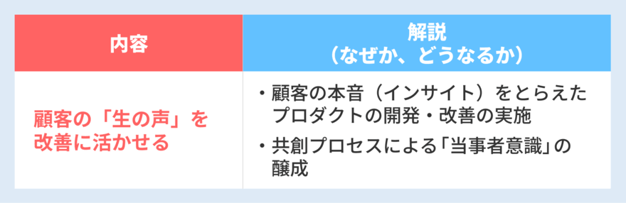 | 顧客の「生の声」を改善に活かせる | ・顧客の本音(インサイト)をとらえたプロダクトの開発、改善の実施 ・共創プロセスによる「当事者意識」の醸成 |