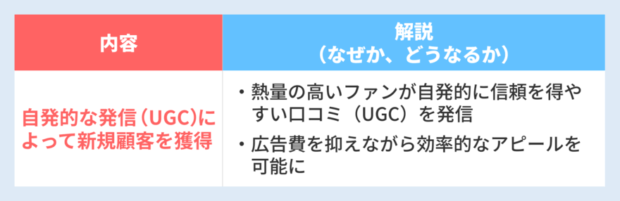 | 自発的な発信(UGC)によって新規顧客を獲得 | ・信頼を得やすい口コミ(UGC)を熱量の高いファンが自発的に発信 ・広告費を抑えながら効率的なアピールを可能に |